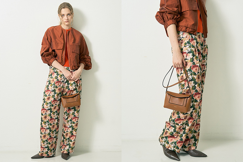 深みのあるカラーのブルゾンに、花柄パンツを合わせた華やかなコーディネート。秋らしい温かみのあるカラーと大胆な柄の組み合わせが、今の気分にぴったりです。
