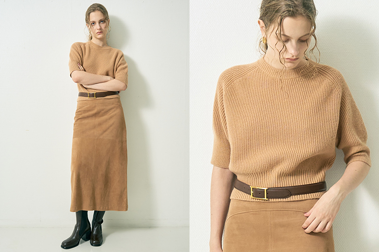 ニットのトップスにスエード素材のスカートを合わせ、ブラウンのベルトでウエストマークした秋らしいスタイル。暖かみのあるトーンを重ね、ベルトのアクセントで全体にメリハリをプラス。シンプルながら洗練された、大人の女性にぴったりなスタイルです。