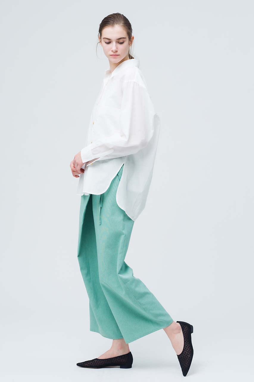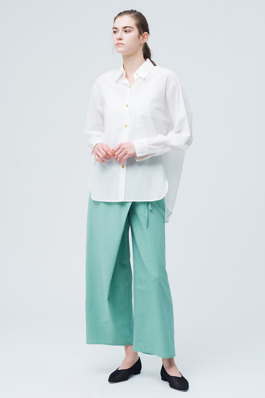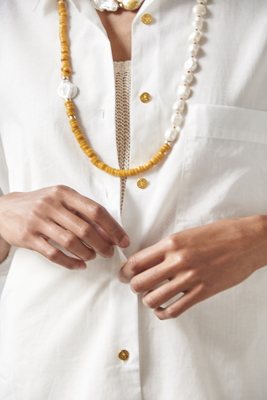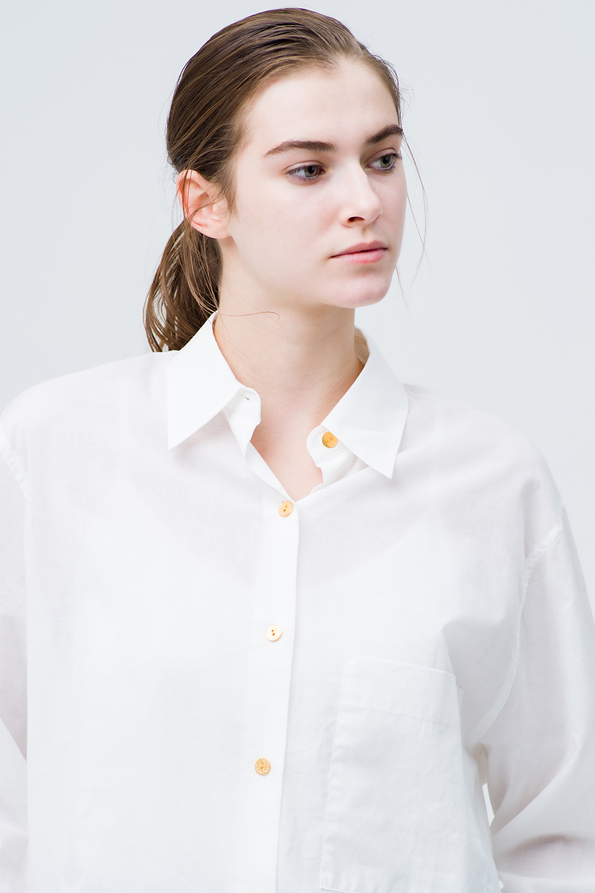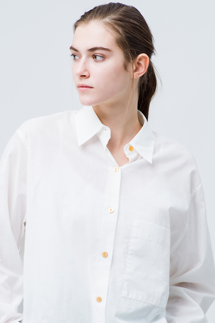 「デミリー」のシャツを日頃から愛用していたリジーフォルトゥナートの双子の姉妹。「白シャツは時代を超越しており、信じられないかもしれませんが、完璧な白シャツを見つけるのはとても難しいことなのです。今まで生きてきたなかで完璧なシャツ」と語る双子の姉妹たってのリクエストで実現した一枚です。ジュエリーライクなメタルボタンはジュエリーとの相性抜群!