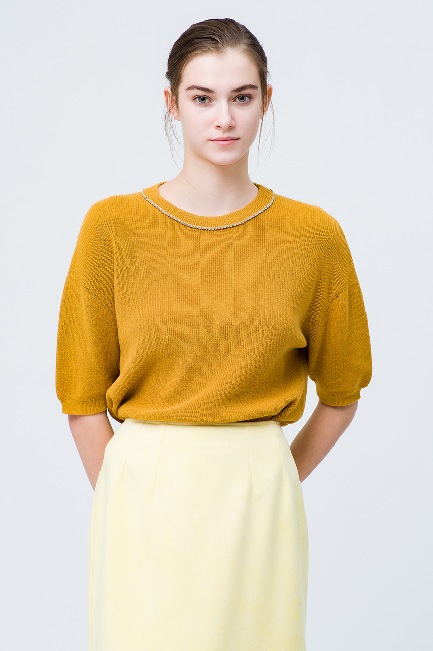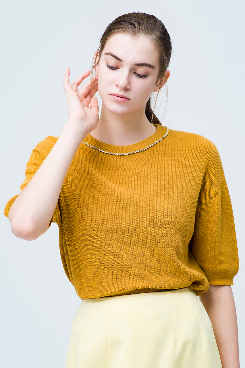 【LIZZIE FORTUNATO】ラインストーンネック ハーフスリーブコットンニットプルオーバー
