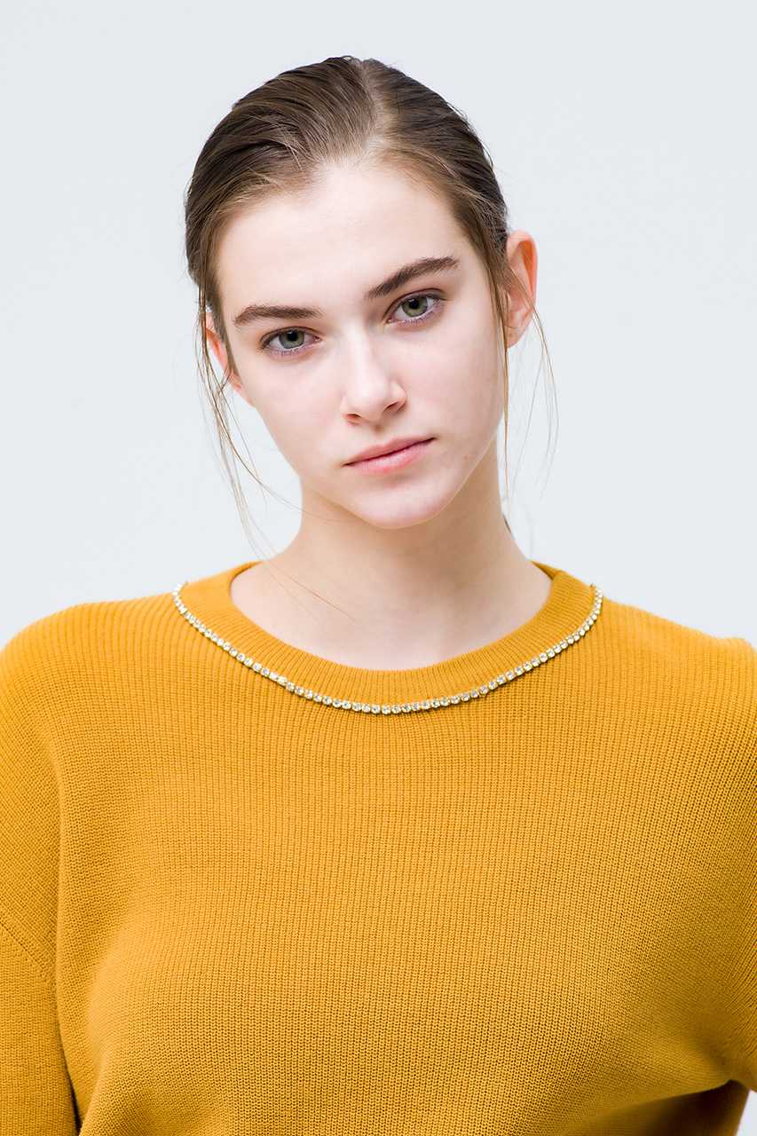昼でも夜でも着られるように、と作られたプレイフルなニット。首元に輝くラインストーンが、上質な天然コットンで編まれたニットのクラシックシルエットをドレスアップしてくれます。
