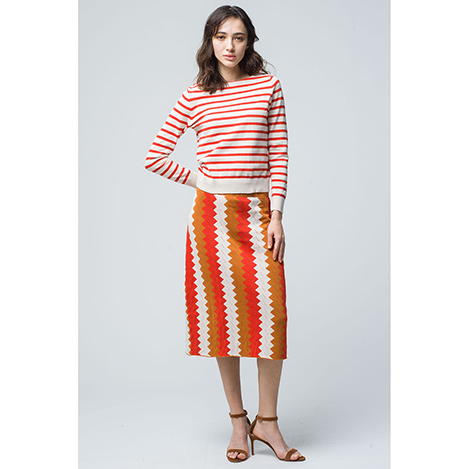 カプセルコレクションの中でも特に目を惹くジグザグアーガイル。ビタミンカラーのオレンジは同色ボーダーニットと柄on柄で合わせても素敵。ベストはシンプルなボトムと合わせてスタイリングの主役にして。