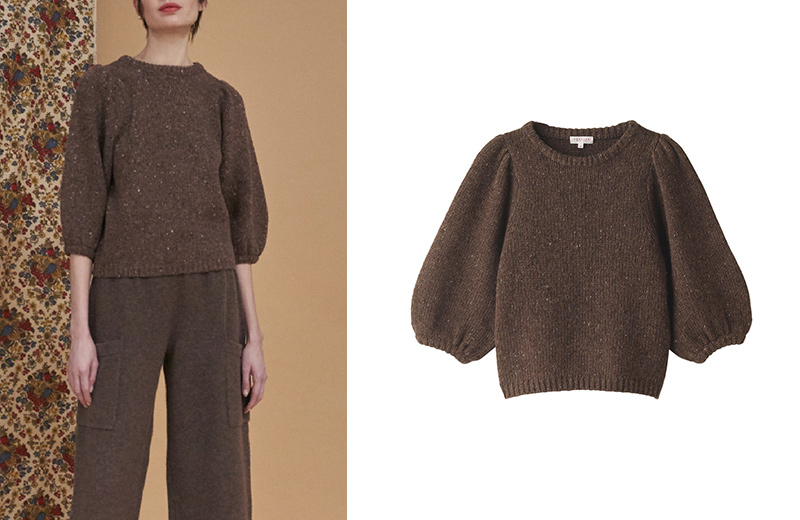 甘さの漂うバルーンスリーブをシックなカラーにすることで大人かわいく仕上げた七分袖ニット。ふくらみのあるウールアルパカ糸はアイルランドのドネガル糸を採用。耐久性に優れており、編地にやや縮絨加工が施されているのでとても暖かいのが特徴です。カジュアルはもちろん、冬のオフィススタイルにも大活躍しそう。