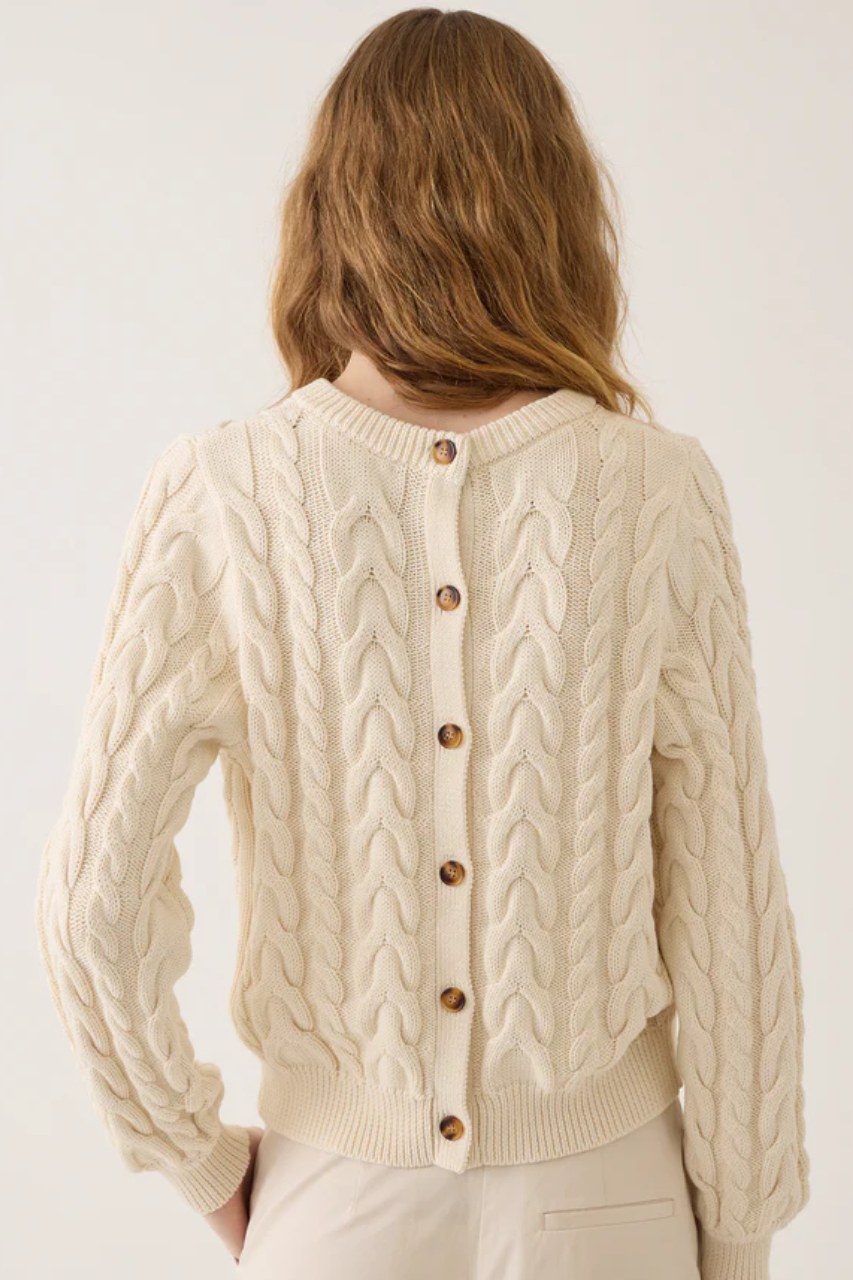 バックスタイルにボタンがあしらわれたケーブルニットプルオーバー。ボタンを前にしてカーディガンとしても着られる2WAY仕様。ローゲージで編まれたコットン100%ニットは、秋口から長い期間活躍する心強い一枚です。