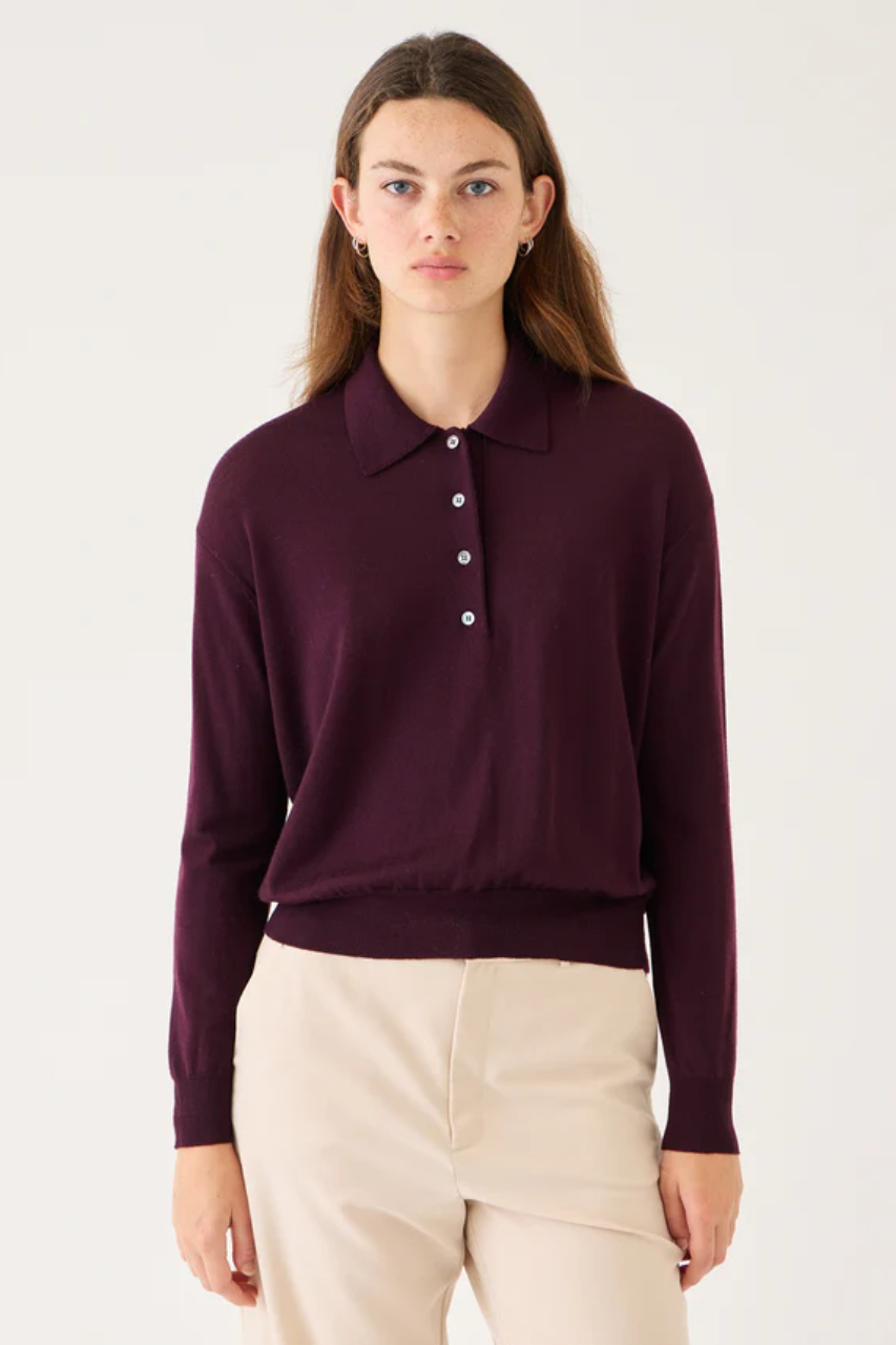 シアーな薄手メリノウール100%で高級感が漂うポロニット。バーガンディとブラックの落ち着いたカラーバリエーションは、秋の着こなしにすっと馴染み、オフィスにもデイリーにも活躍。軽やかでしなやかな編地は重ね着してももたつかず、上品なシルエットをキープ!