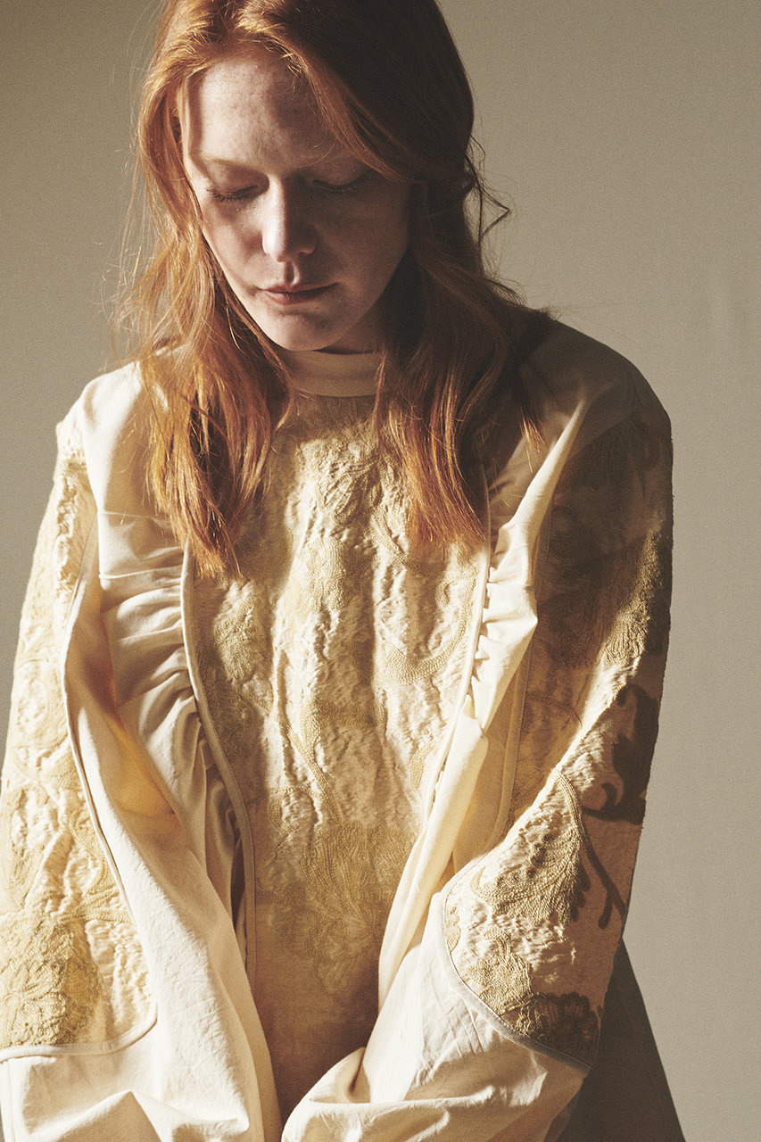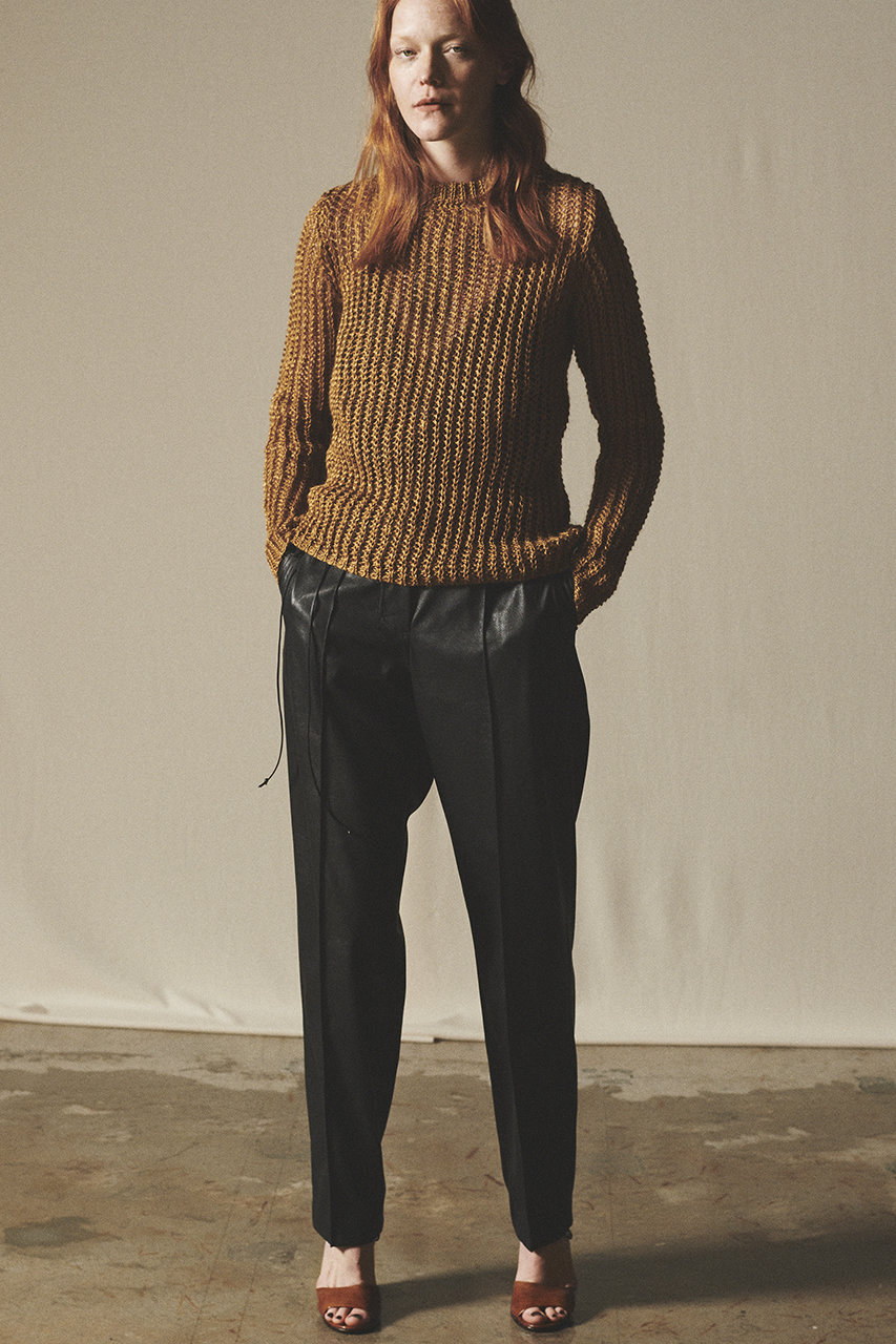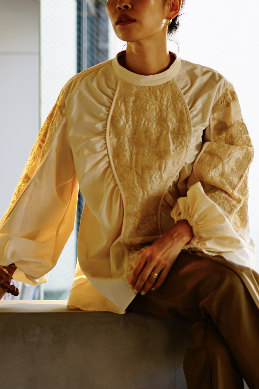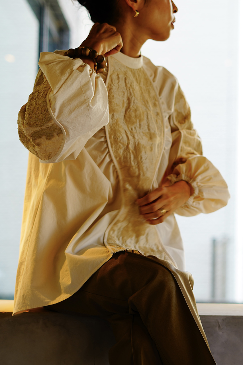 シルク・リネン素材のベースに繊細な刺しゅうを施した生地が特徴的なブラウスに、上質なエコレザーを使用した美シルエットのパンツを合わせたコーディネート。ボリュームのあるトップスにスマートなボトムを合わせることでシルエットと素材感にメリハリをつけました。どちらも様々なコーディネートで活躍する万能アイテムです。