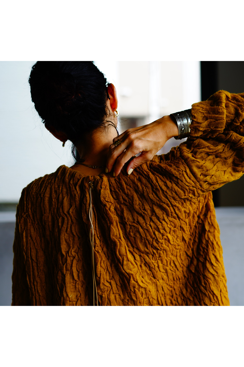 表面感のある編み地で分量たっぷりに仕上げたニットにエコレザーとボアのコンビネーションアウターを羽織りました。ニットは後ろにある紐を調整することで襟ぐりの開きやギャザー感を調整することができるので、インナーの合わせ方で秋から春まで長く楽しめます。アウターはファスナーで袖を外すことができ、ベストとしても活躍する2wayアイテムです。