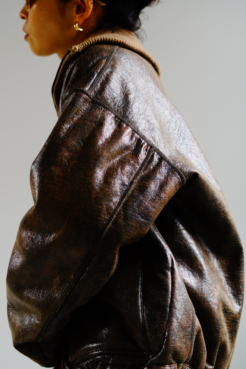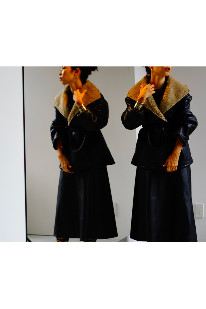 リバーシブル仕様で2種類の表情が楽しめるブルゾンを、ボア面を表にして着用。カジュアルに見えがちなモコモコアイテムにエコレザーのスカートを合わせることで大人っぽいコーディネートにまとめました。反対側は雰囲気がガラッと変わったヴィンテージライクなエコレザーになっており、2wayでお楽しみいただけるアウターです。