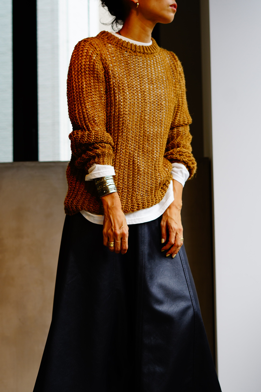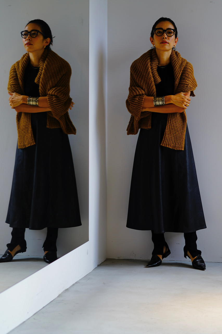 リネンの糸をモヘヤ風に仕上げた珍しい風合いのニットは、オールシーズン活躍するおすすめアイテムです。こちらのコーディネートは中にロンTを重ねてフレアスカートを合わせ、シックにまとめました。コーディネートに合わせたフレアスカートはエコレザー素材を使用しているため甘さ控えめで、様々なトップスと合わせやすい万能アイテム。これからの季節はブーツを合わせるバランスがおすすめです。