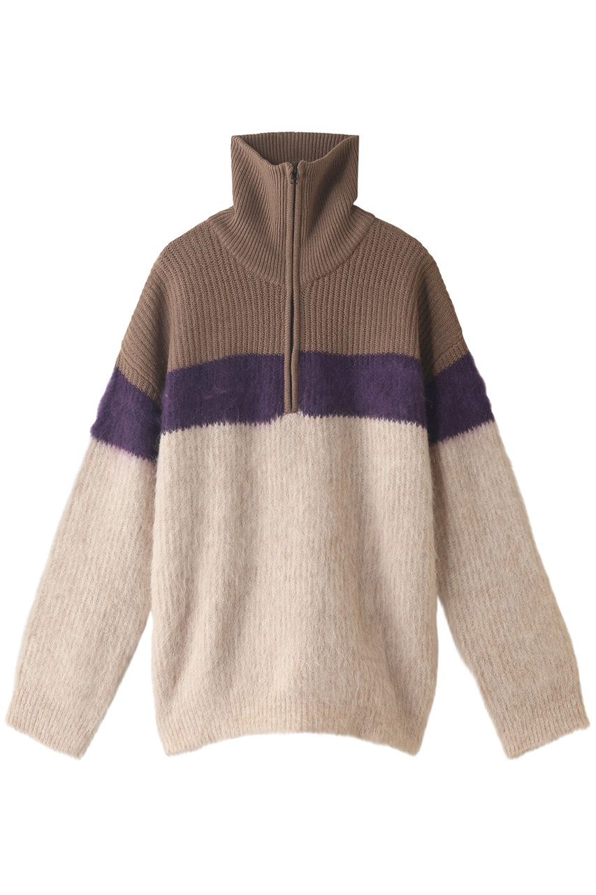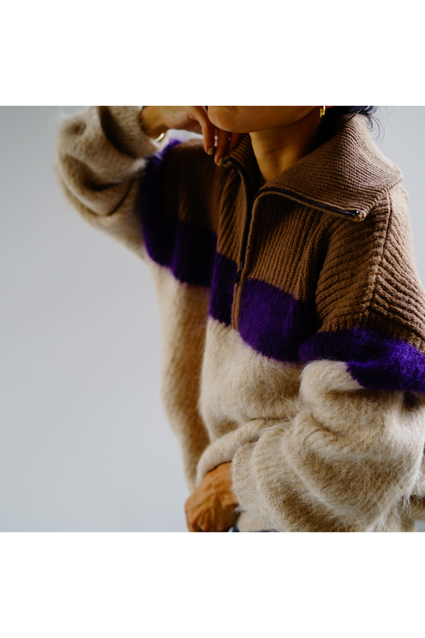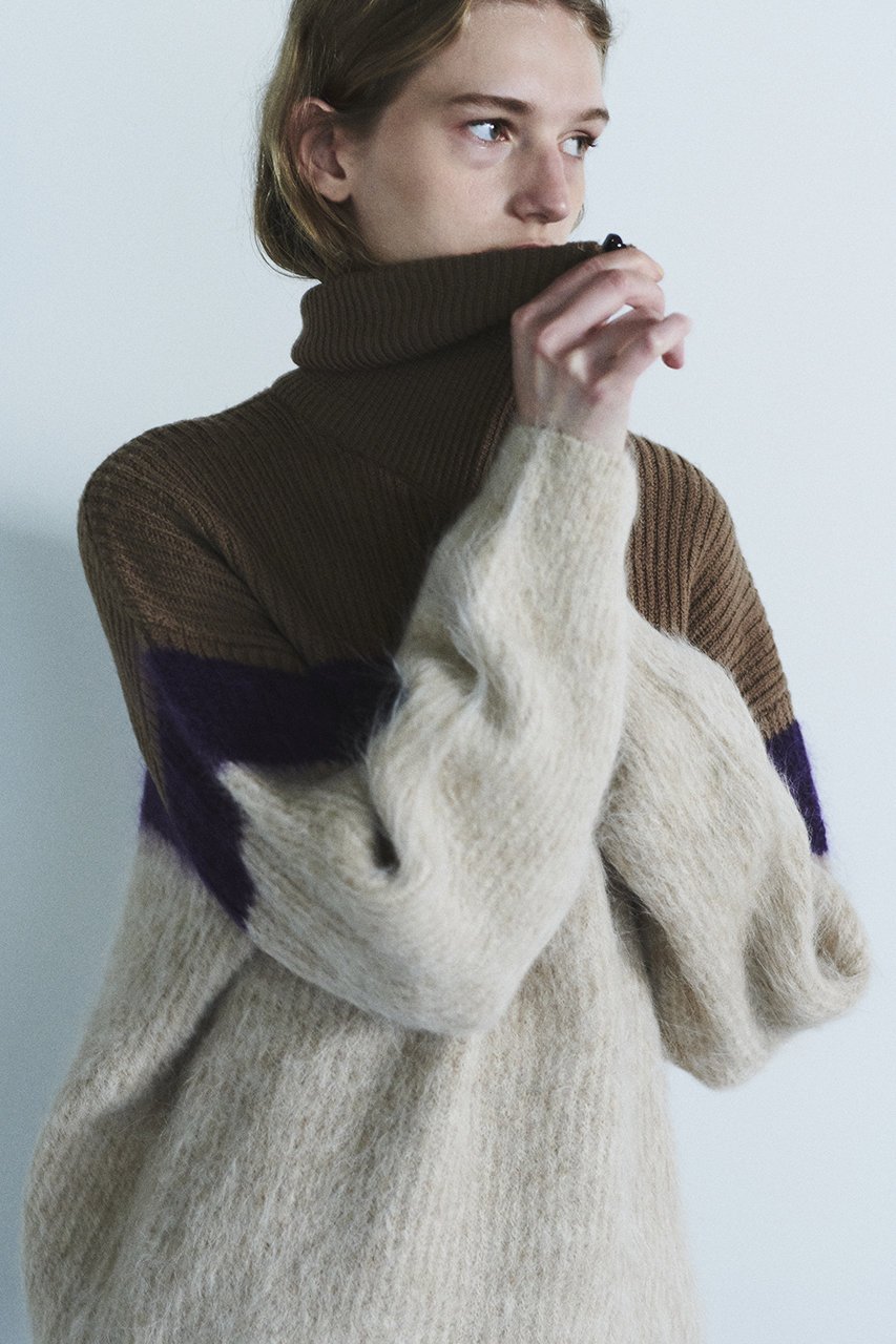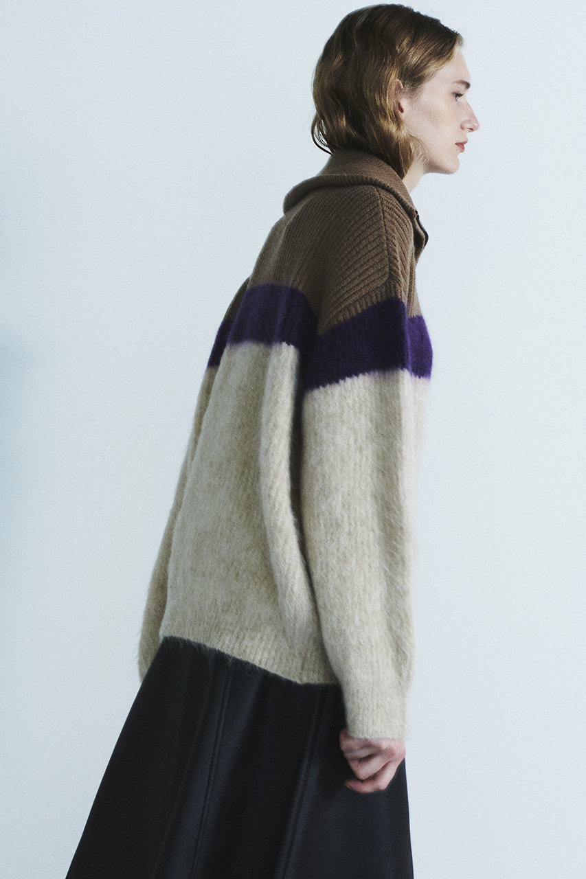 3色の配色が目を引くセーターは襟元と身頃の糸を変えているため、風合いのコントラストも楽しい1枚です。身頃と袖のふわふわ感で着心地も抜群に仕上げました。エコレザーのフレアスカートを着まわしアイテムとして合わせ、素材感の違いのバランスを楽しむコーディネートにしました。