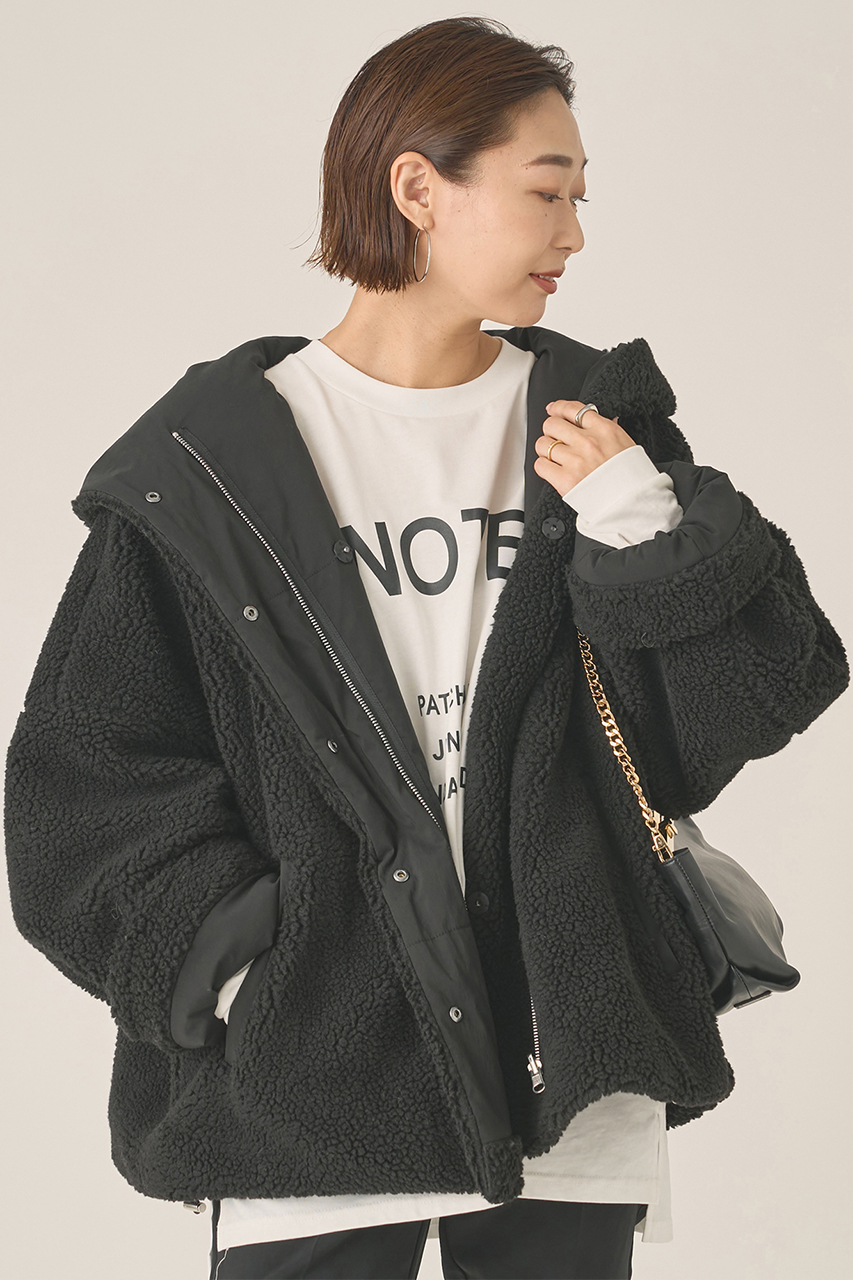 フード付きで首元まで暖かな設計、フロントはジップとボタンでイージーな着脱