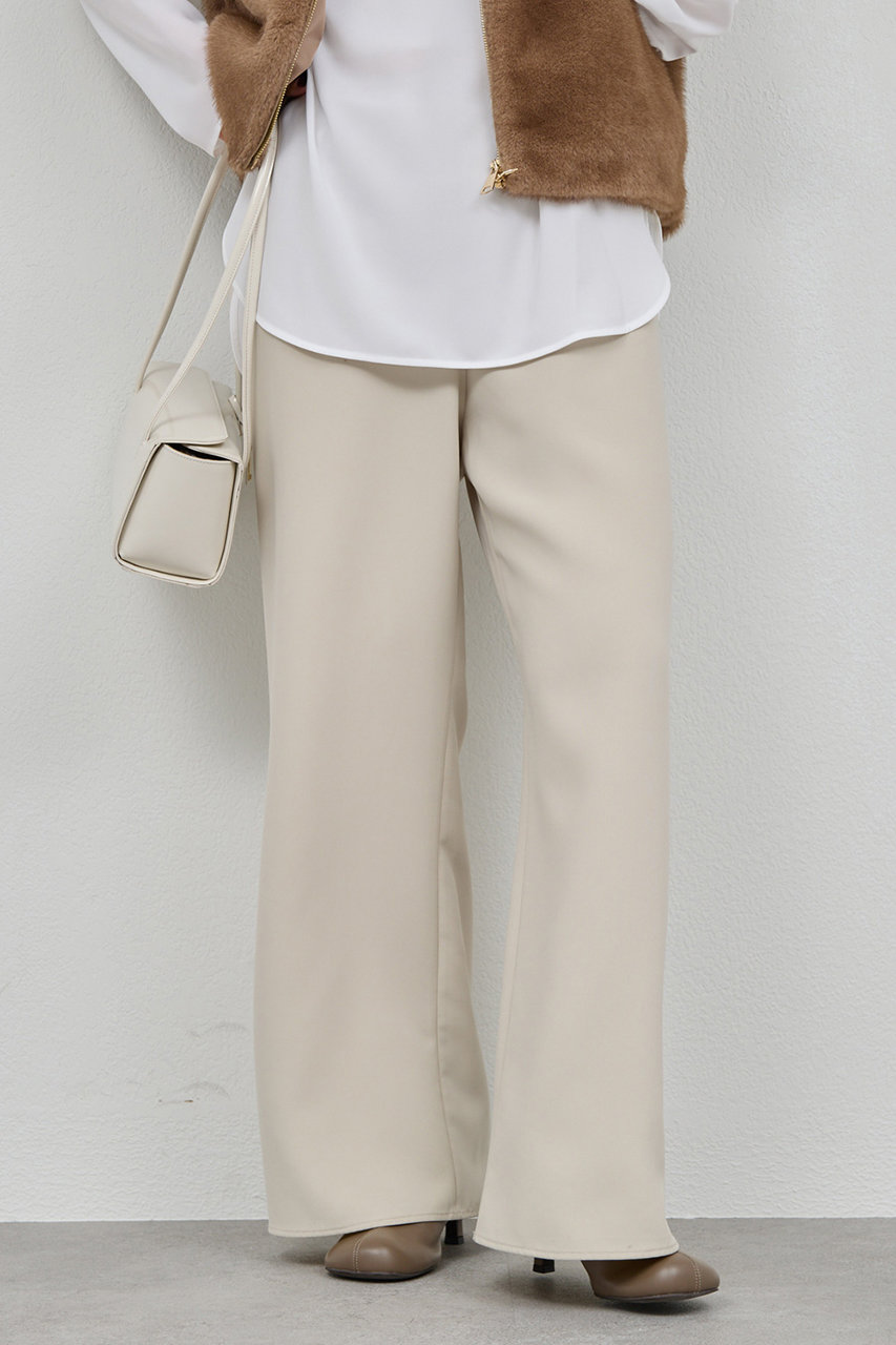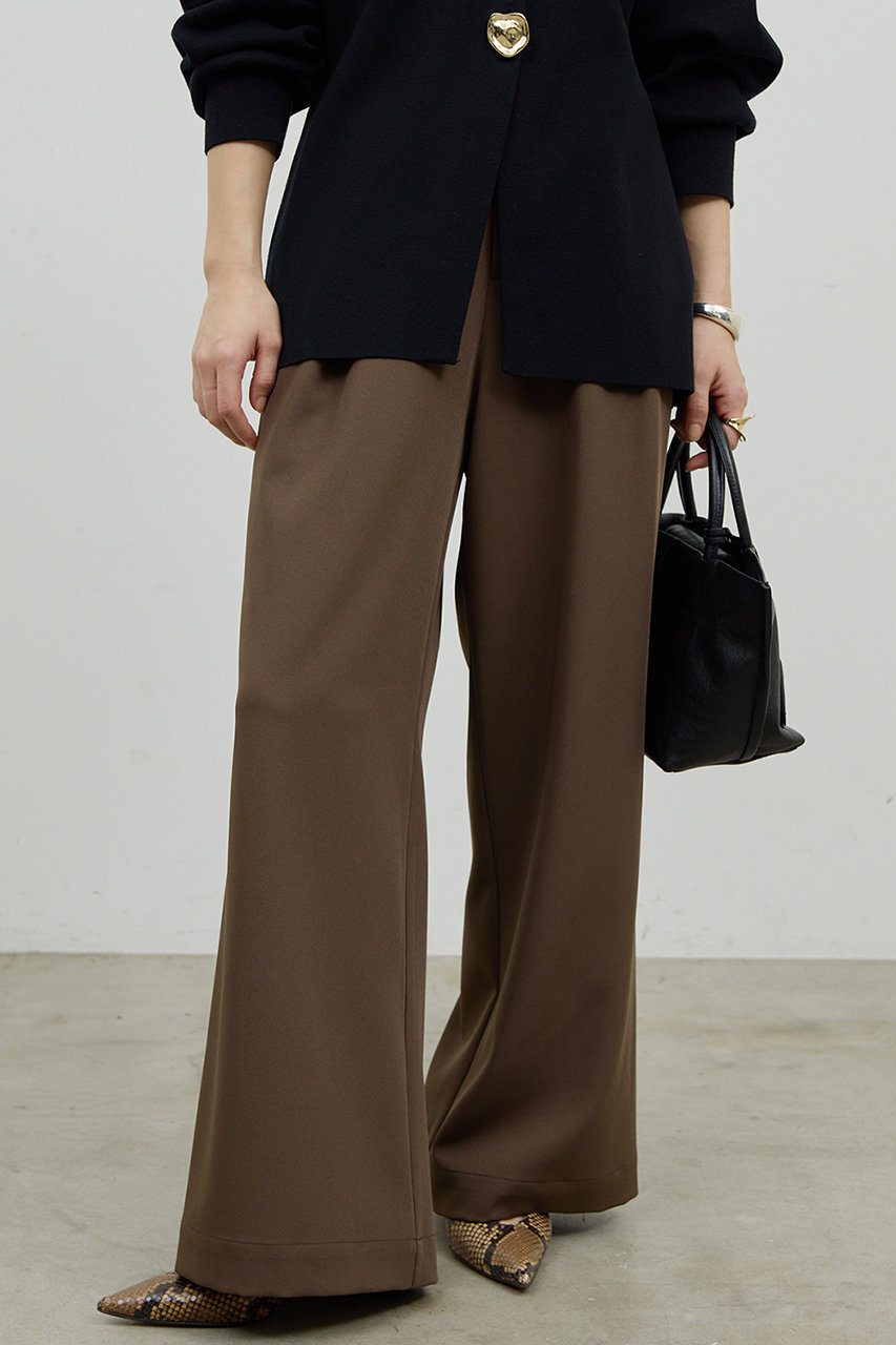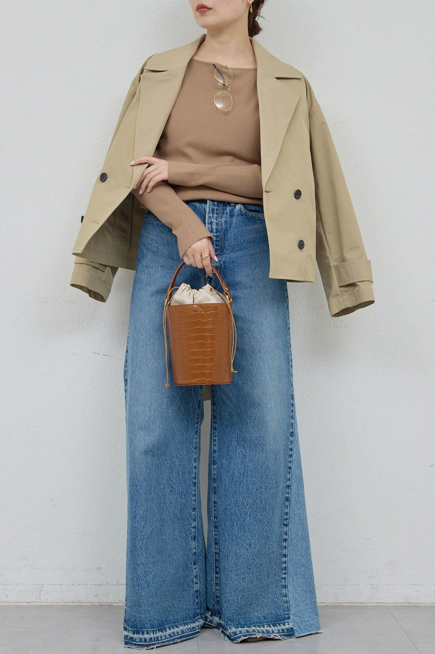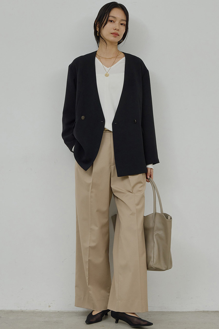 脚のラインを拾わないハリのあるシルエットと、通年活躍する素材感。