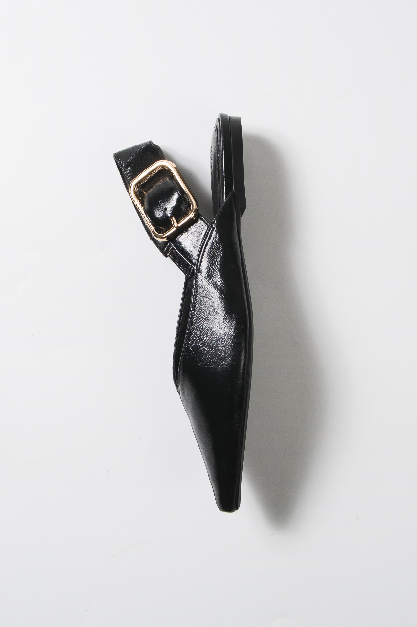 シャープなポインテッドトゥに、ほどよい存在感を放つゴールドバックルが視線を引き寄せる一足。