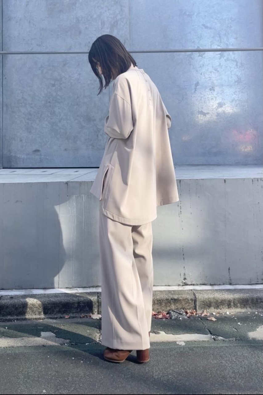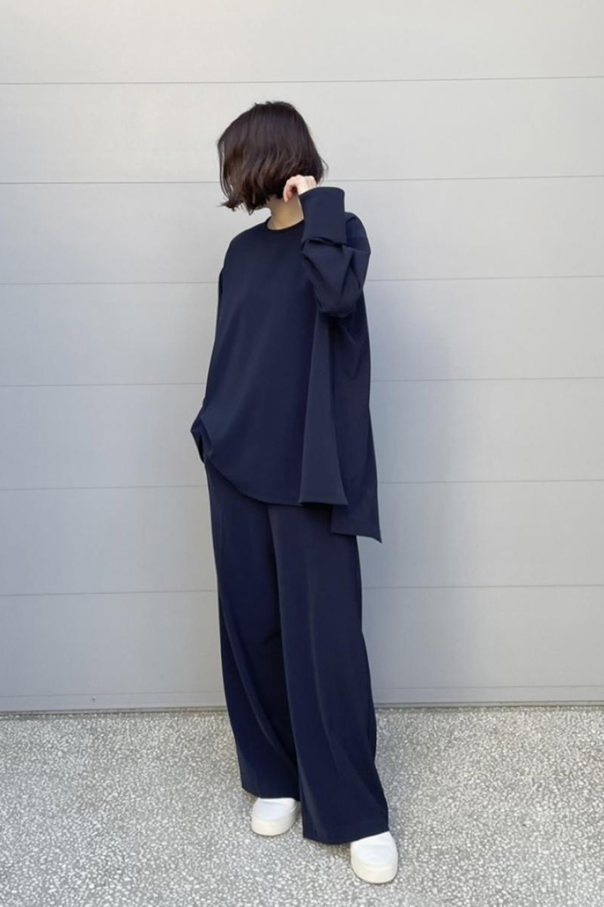 程よい身幅でシンプルな印象のダブルクロスのワイドパンツ。シワになりにくく、糸のふくらみと高密度のハリ感が特徴です。同素材のブラウスとのセットアップは、オケージョンにもおすすめ! さりげないモードを感じさせるスタイルが完成します。トップスはデニムと合わせたり、パンツはふんわりブラウスと合わせたりと、シーズンレスで活躍します。大人のマニッシュスタイルをアシストする、様々なシーンで活躍するアイテムです。