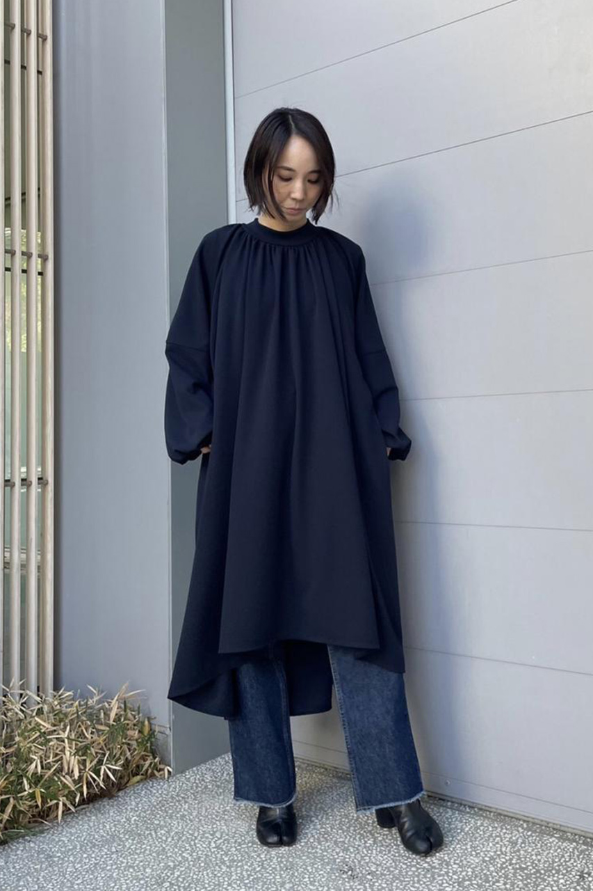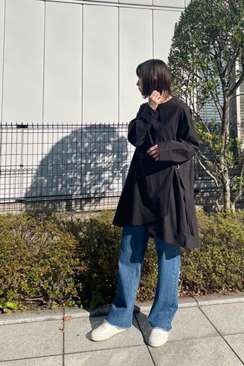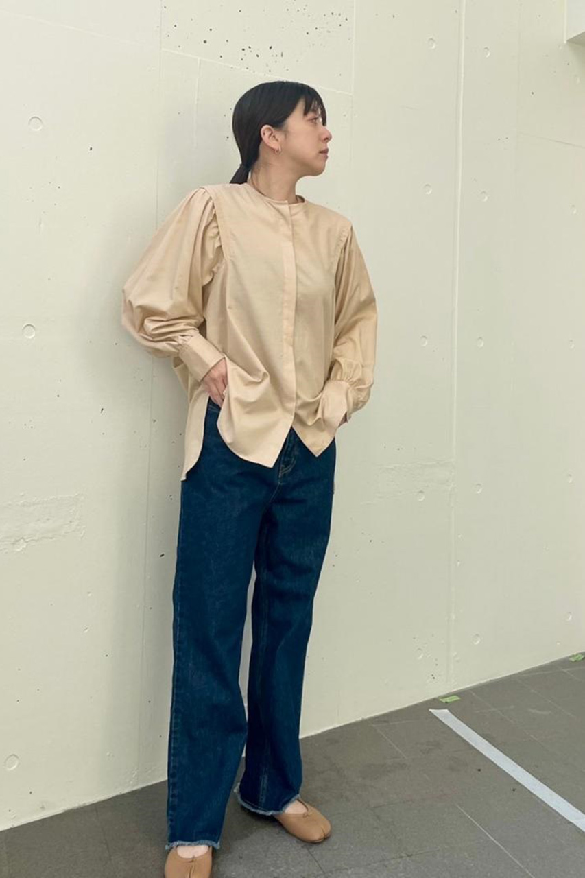 太めのデニムはショート丈のアウターとの相性が◎。ドレープ感のあるエレガントなブラウスと合わせれば、簡単にはずしのコーディネートにも。素材は上でご紹介したデニムと同素材。ナチュラルな風合いでほどよくゆとりのあるテーパードシルエットは、はくだけでスタイリングに着崩したような雰囲気に。太めのラインでも裾を絞っているので、ワイドデニムよりもスッキリとした印象です。