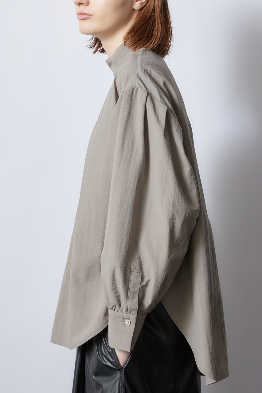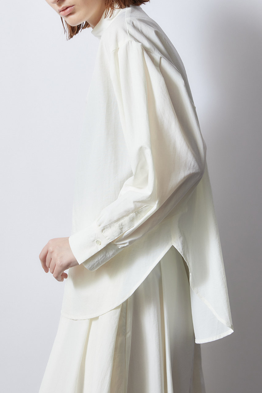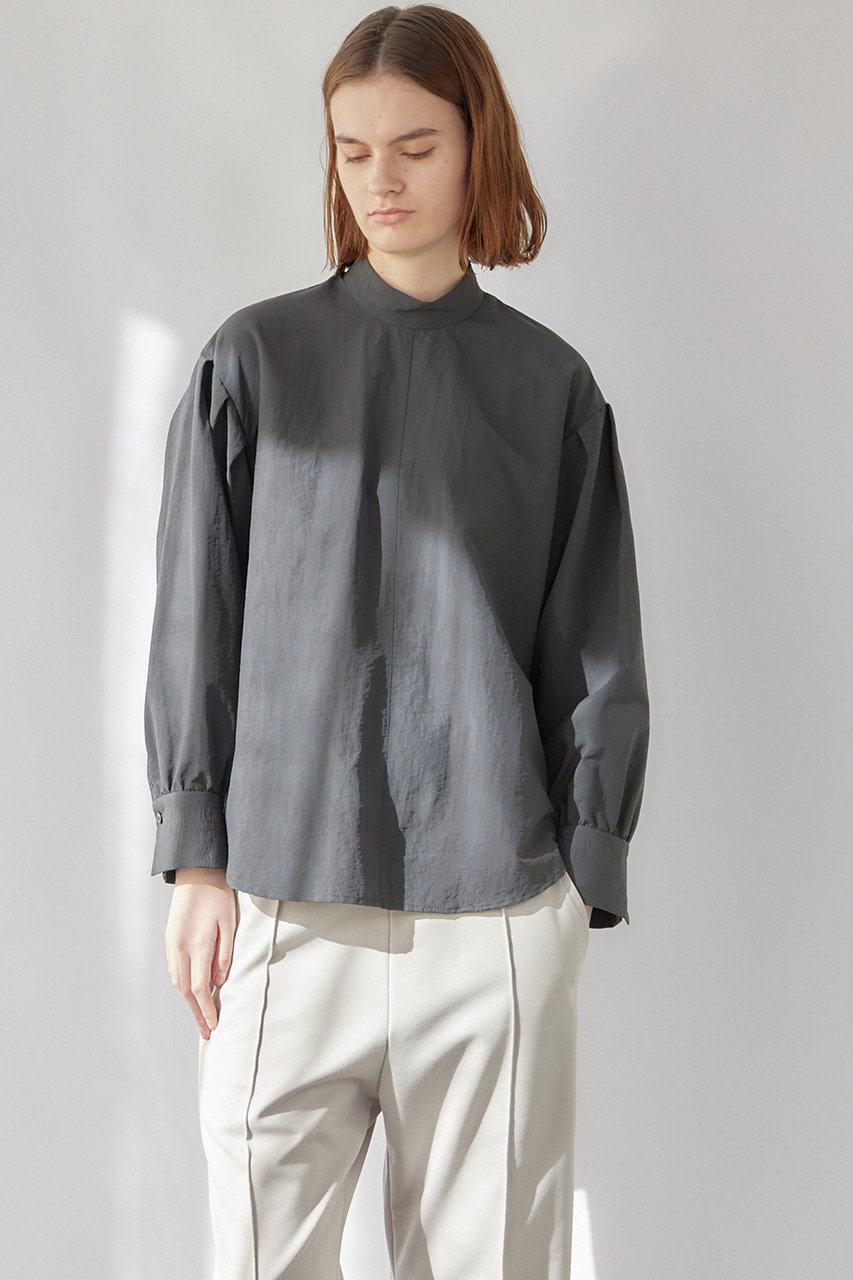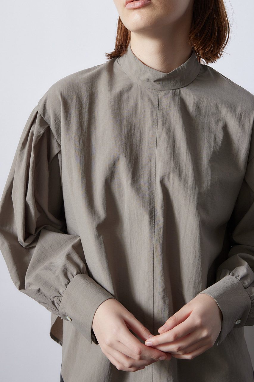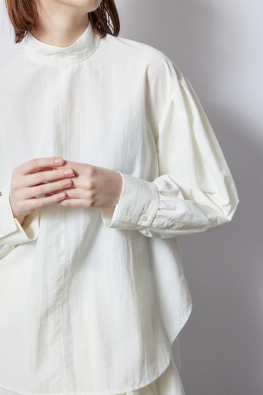 一枚で華やかさと気品をまとうハイネックブラウス。程よい高さのネックラインと袖口のギャザーが、クラシカルな美しいシルエットを演出します。スパンタッチのフィラメントを使用した平織り素材は、きれいめながらも天然繊維のような軽やかな肌ざわり。タンブラー仕上げによる自然な表情が、シンプルなデザインにさりげない華やかさを添えます。