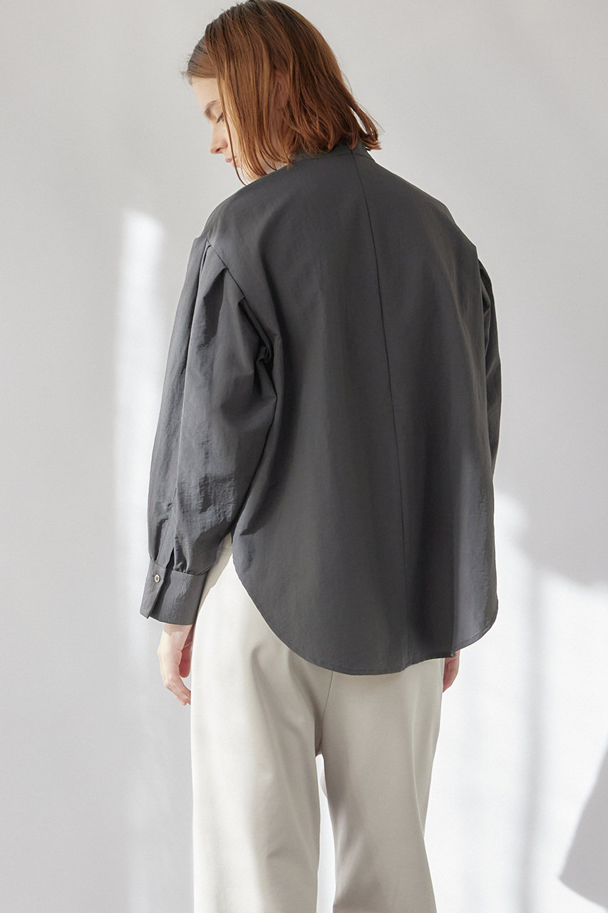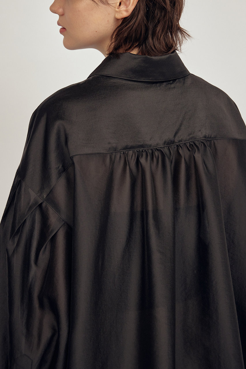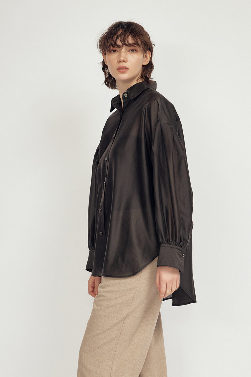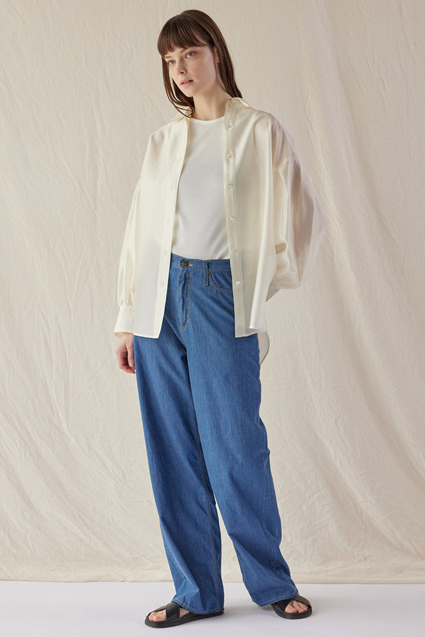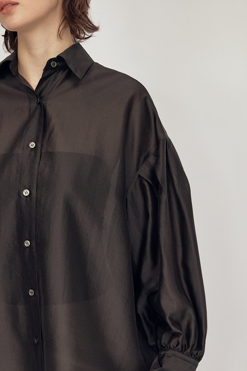 シルクライクなオーガンジー素材のシャツブラウス。春らしい爽やかなバルーンスリーブが印象的な一着です。襟付きのゆったりシルエットでリラックス感がありながらも、洗練されたムードに。シンプルな着こなしにもシャープさを添えてくれます。デニムでカジュアルに、スラックスでオフィス仕様にも。ボタンを開けて夏の軽羽織としても活躍する、オンオフ問わず頼れる一枚。