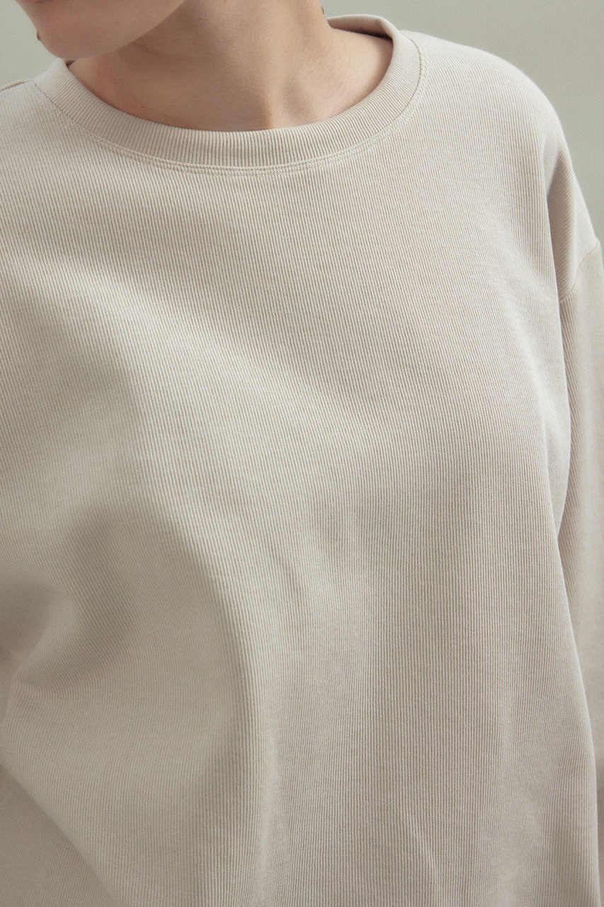 ワンカラーながら1枚でサマになるボリュームスリーブのプルオーバー。ニットライクな表情と透けない肉感がポイントのハリヌキジャージは、シーズンレスに使えるよう混率にもこだわった1枚。ボディラインを拾わずリラックスして着用できるのが魅力。
