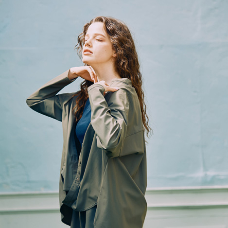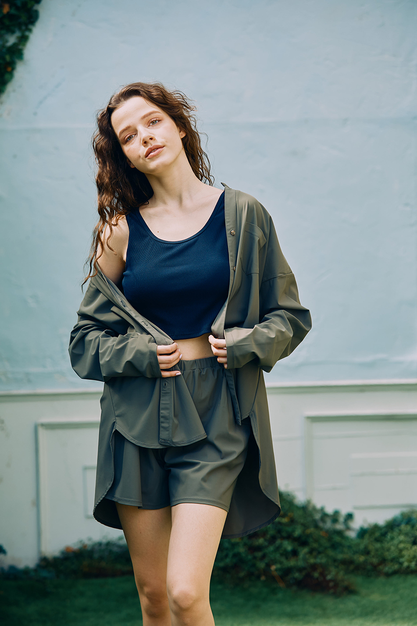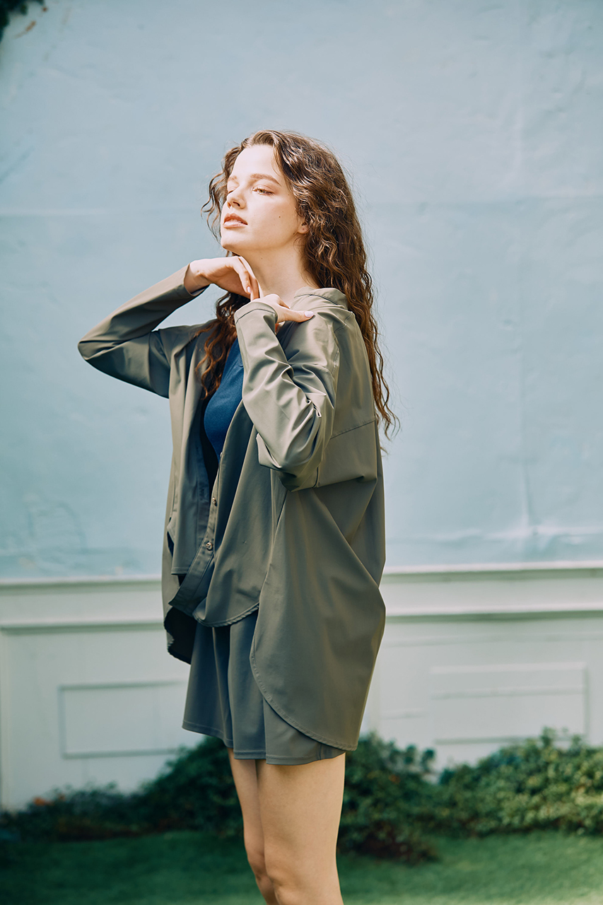 サラッとした質感でストレッチ性もあり肌触りのよいシャツがセットになったビーチウエア。持ち運びに便利な羽織りシャツはバッグに忍ばせてもシワになりにくい素材を使用しています。もちろんUPF50+の紫外線防止機能つき。デイリーシーンでも着用出来るユーティリティなセットアップデザイン。オーバーサイズでゆったりとしたシルエットです。インナーはカップ付きのトップスなので普段使いにも重宝します。