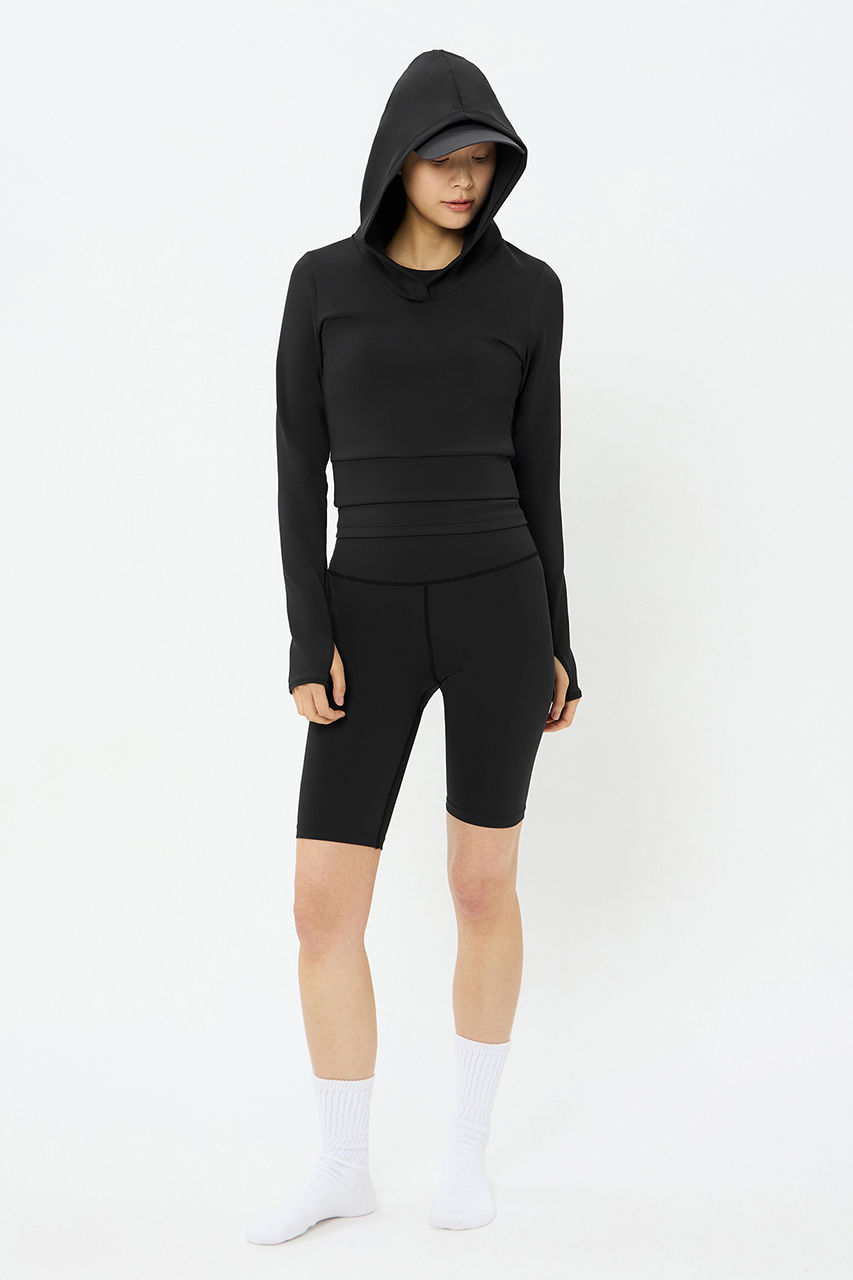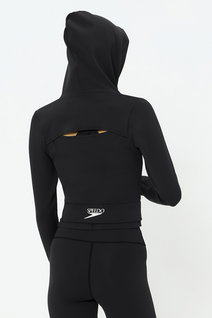 ボディラインをスッキリ見せるショート丈。フードが大きめなのですっぽりかぶれば、すっぴんのままでも可愛く周囲の視線をカット。背面ホールにより背中のチラ見せも楽しめます。
