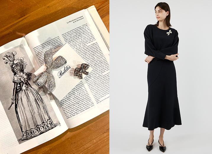 シンプルなセットアップも華やかに昇華してくれるブローチ。シルバーベースとゴールドベースののリボンモチーフをご用意しています。