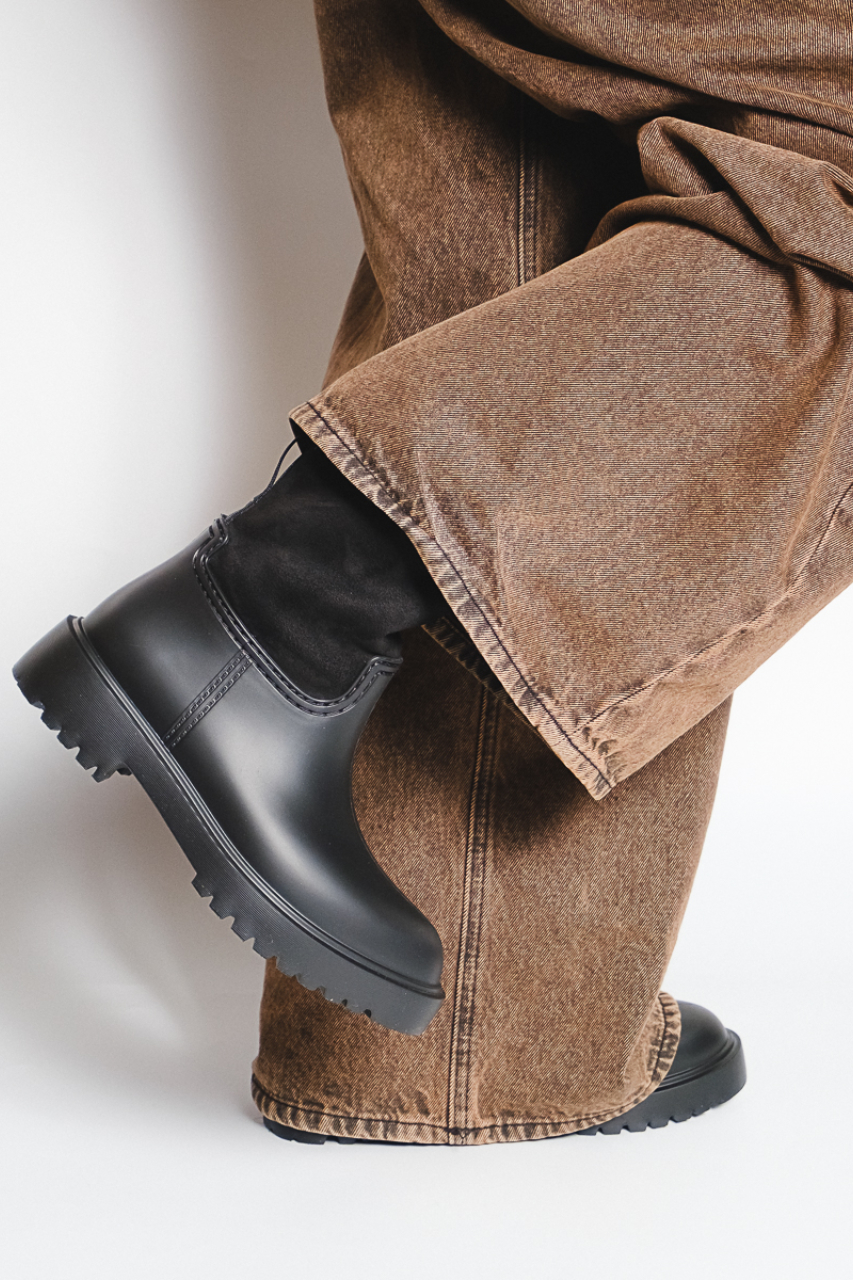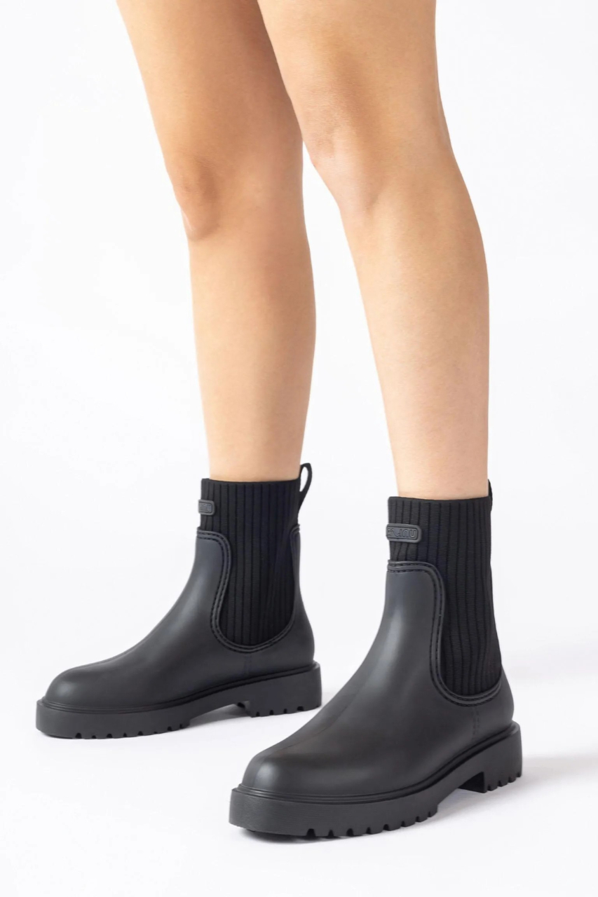 マットな質感のラバー素材に、リブニットのサイドパネルが洗練された抜け感を添え、足首に優しくフィット。