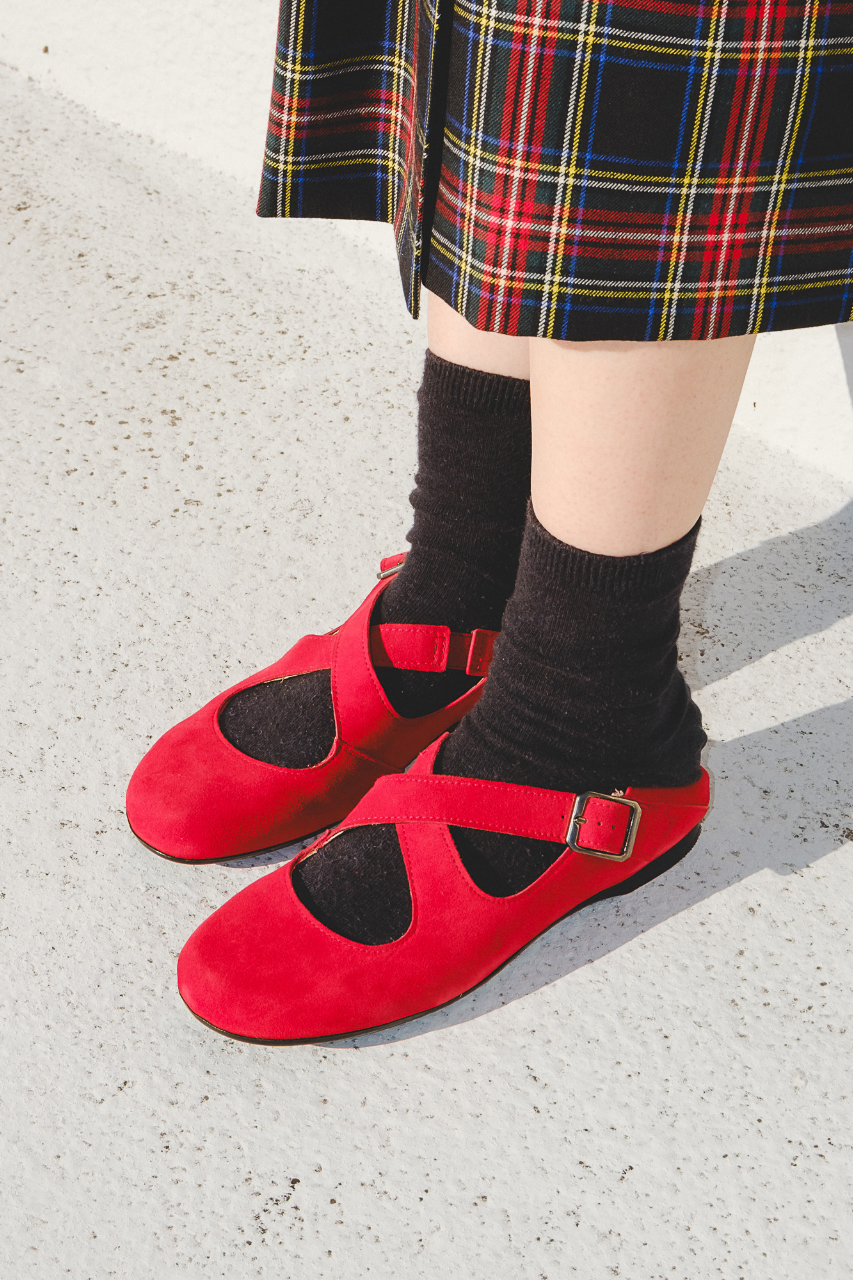 スエードの柔らかな質感をまとい、クロスストラップで70〜80年代のムードを漂わせた一足。