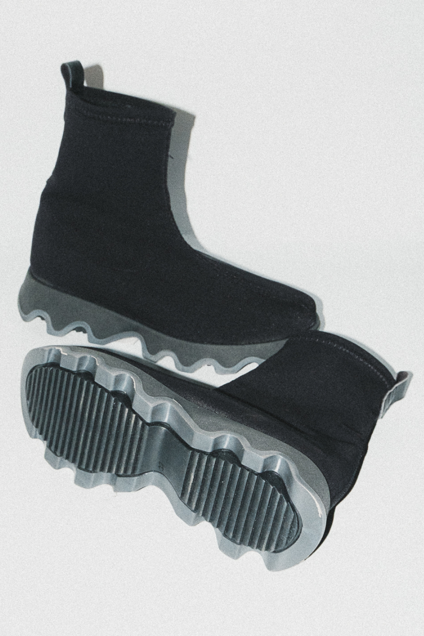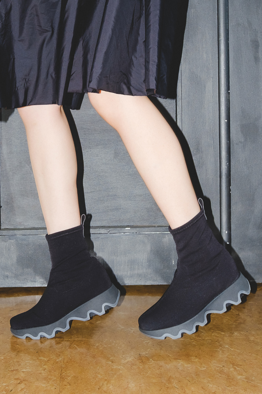 足首にぴったり沿うシルエットと、波打つような厚底ソールがモードな存在感を放ちます。