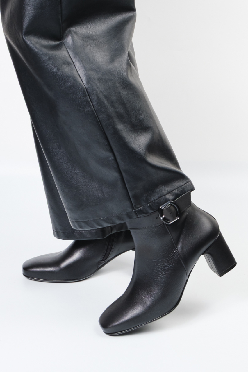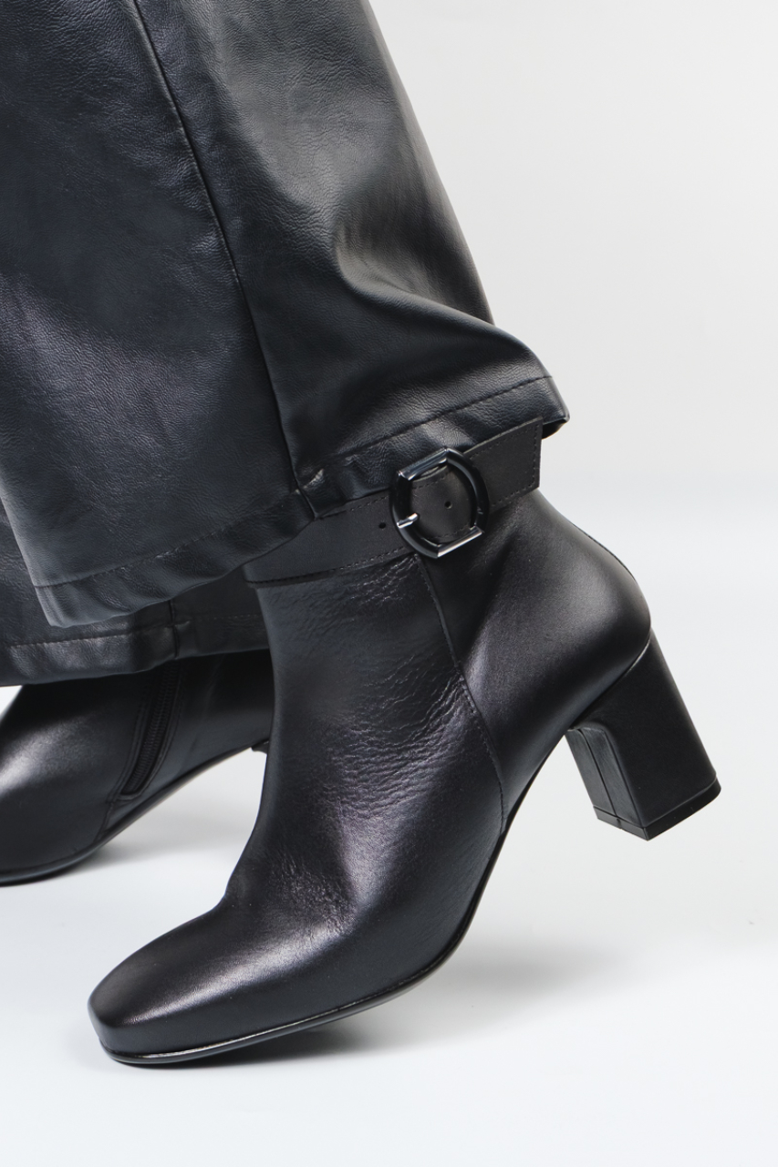 艶やかなレザーの質感と、シャープなスクエアトゥが印象的なショートブーツ。