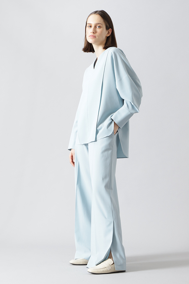 ゆとりのあるサイジングとオープンカラーが、ヌケ感をもたらすブラウス。ソフトでしなやかな肌触りと、上品な落ち感を備えたマテリアルが魅力的。モノトーンカラーで合わせるボトムを選ばないのがうれしい。メインにも、ライトなアウターとしても着まわせる1着。