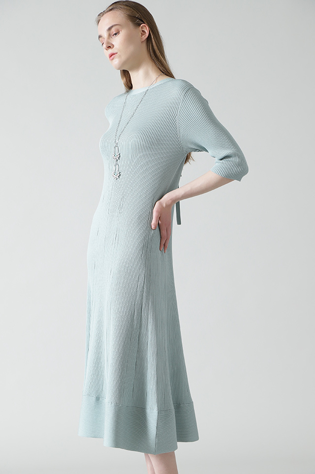 レーヨンとナイロンの強撚糸を使用。柔らかく適度なストレッチ感があり着心地も◎。 緩やかなコクーンシルエットのデザインリブニットワンピース。すっきりとしたシンプルなネックラインなのでネックレスやスカーフも映え、コーディネートが楽しめそう。