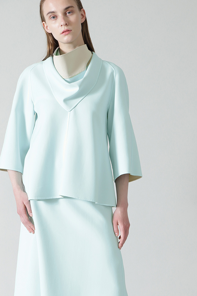二重織の組織により、しっかりとしたシルエット表現ができ、適度な反発感のある素材に仕上げたスカーフ付きブラウス。上品なカラーのコントラストが効いたリバー仕立て。同素材のスカートとパンツとのセットアップコーディネートがおすすめ。