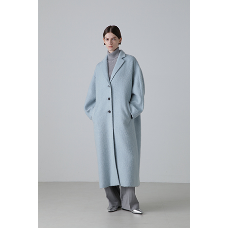 ライトなシャギーモヘア素材を使用したチェスターコート。毛の長さとふわりとした柔らかさが特徴なモヘア(アンゴラヤギ)の毛と軽いアクリルを使用した、膨らみのある長い起毛感が特徴な素材。特徴的なボリュームスリーブがメンズライクなアイテムにフェミニンな雰囲気をプラス。