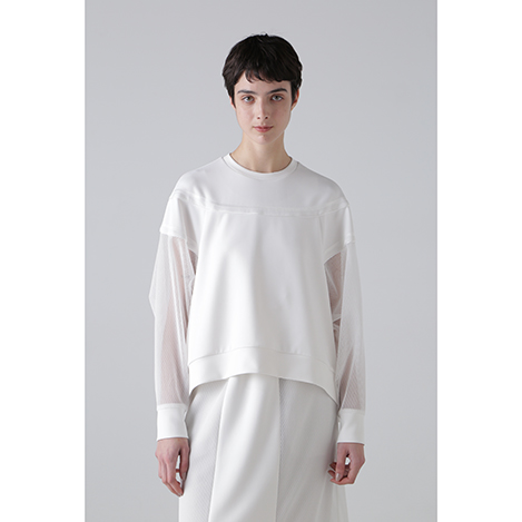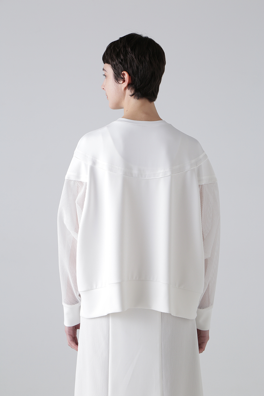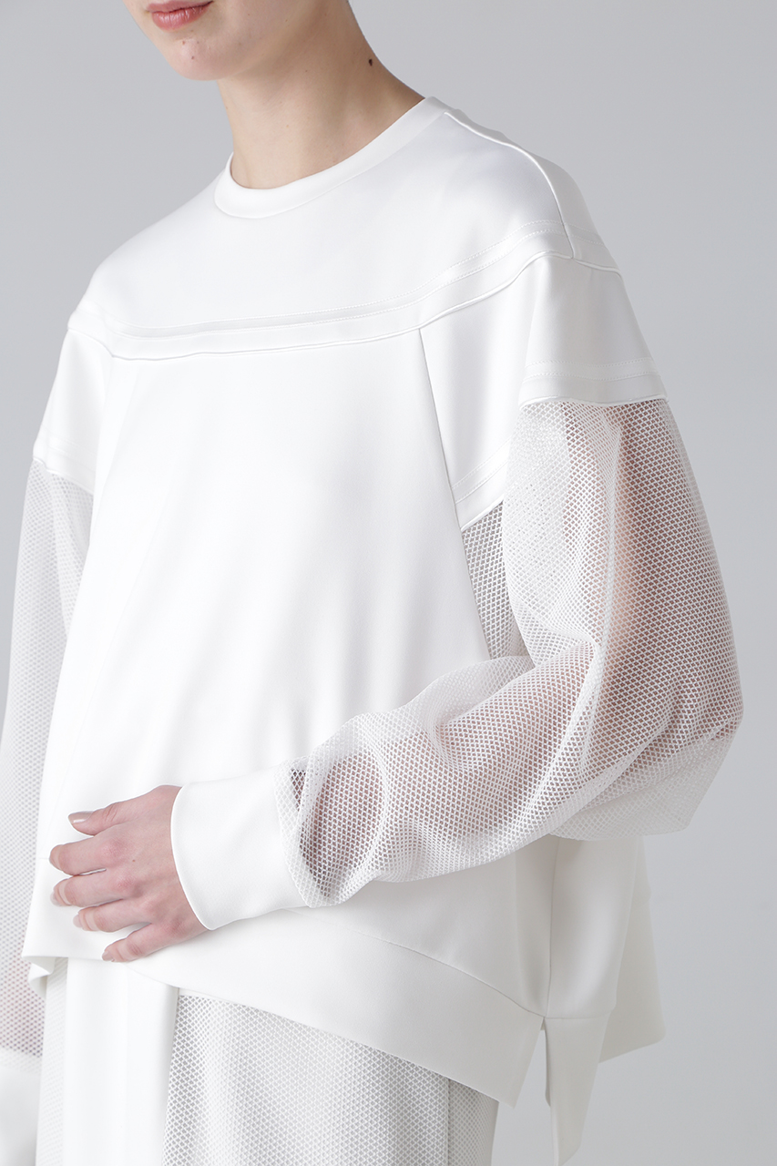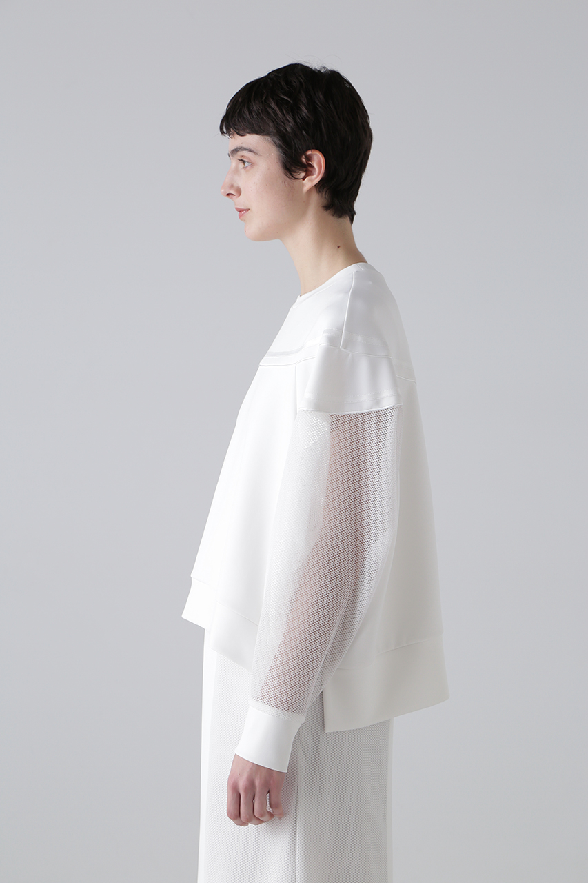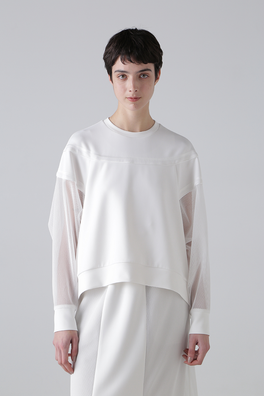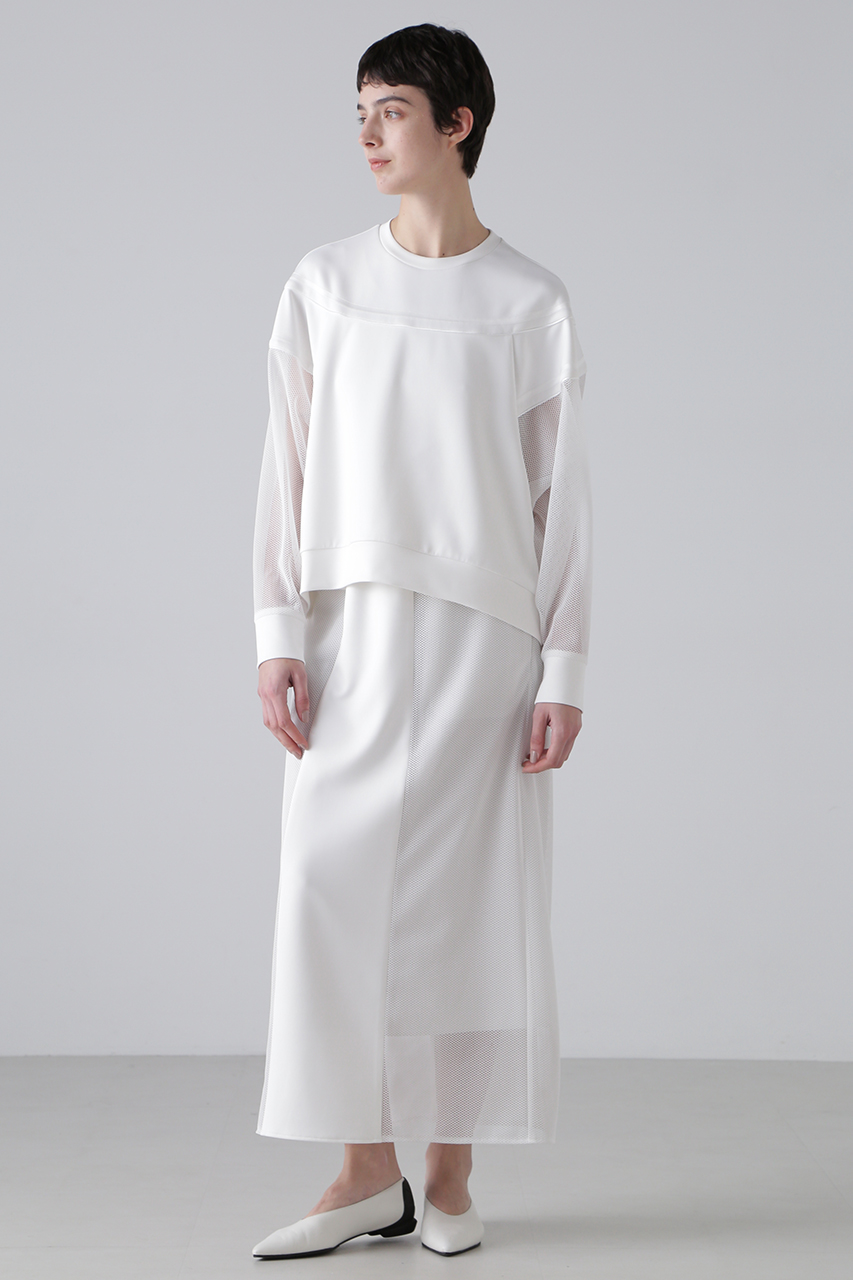 異素材のコントラストが魅力のダンボールカットソー。カットソー素材の身頃と、メッシュ素材の袖を組み合わせ、シンプルながらもモードな雰囲気を演出。切り替え部分にはニットテープ&パイピングテープを施し、さりげないアクセントをプラス。ラグランスリーブ&オーバーサイズのリラクシーなシルエットで、快適な着心地も魅力。同素材のタイトスカートとのセットアップスタイルもおすすめ。