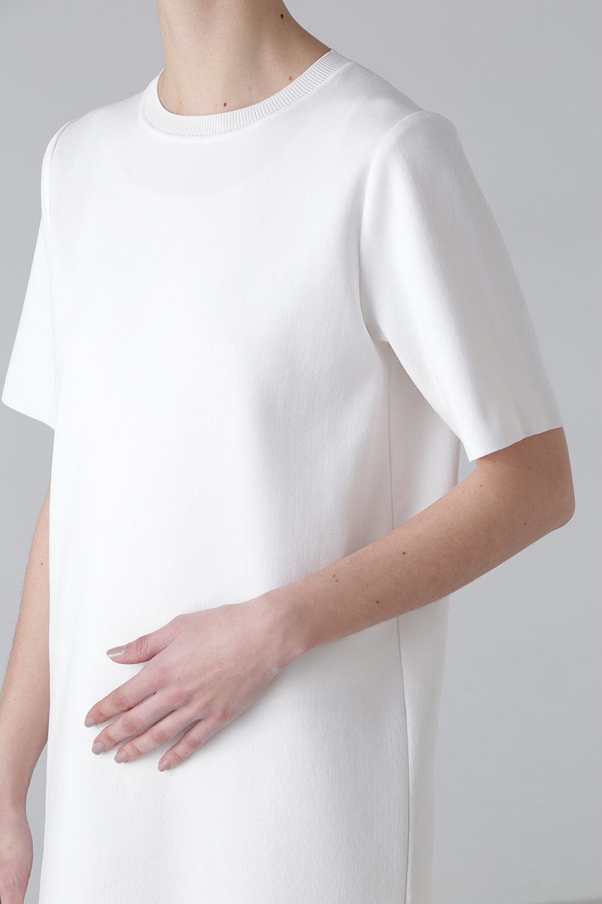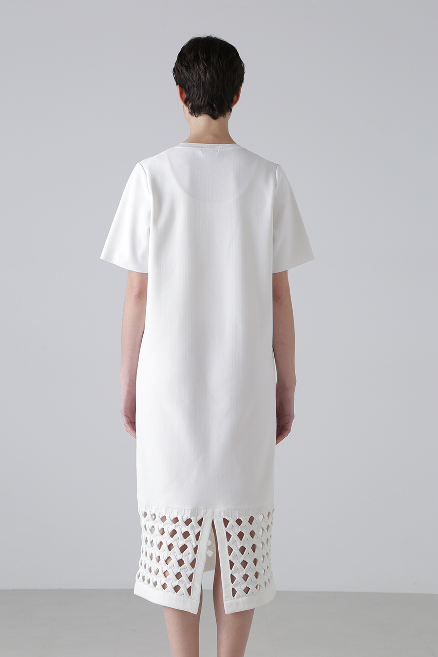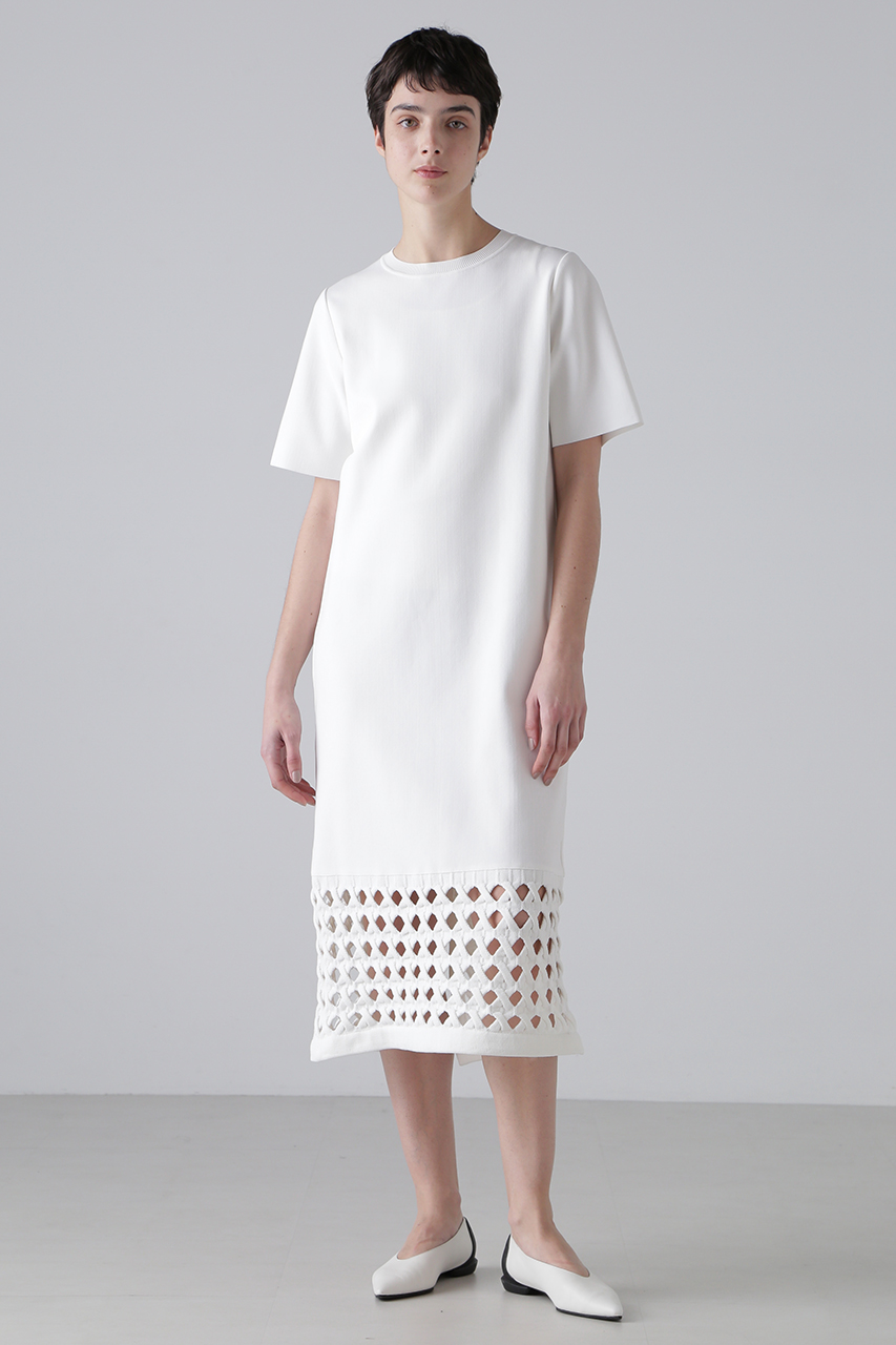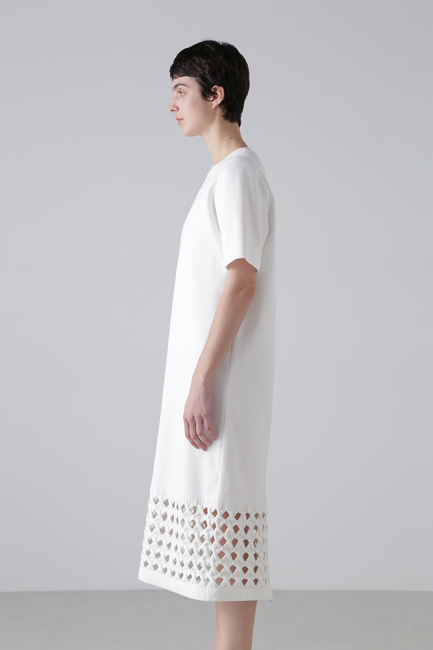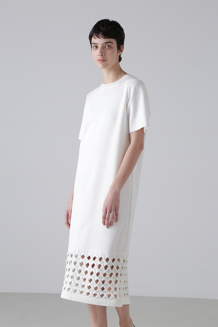 7Gオンリーの特殊な自動機で編み上げた、ケーブル風メッシュが裾に施されたニットワンピース。見頃と袖は素材を変え、ハイゲージで編むことで、重くならず軽やかな仕上がりに。引っ掛かりを軽減した再生ポリエステル糸と甘撚りの綿糸を使用し、ソフトで心地よい肌触りを実現。