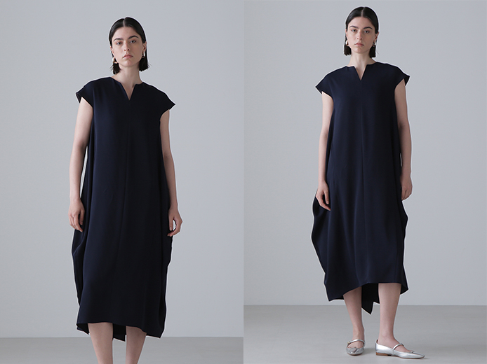 脇の切り替えで自然なドレープを描く、軽やかで上品なジョーゼットワンピース。後ろ襟ぐりに施されたさりげないフリルが、バックスタイルに華やぎを添えてくれそう。シームポケット付きの機能性や、かぶりで着られる手軽さも魅力。ドレープ性と反発感のある素材が、シルエットを美しくキープ。同素材のブラウスやパンツとのコーディネートもおすすめで、オンからおよばれまで幅広く活躍してくれそう。