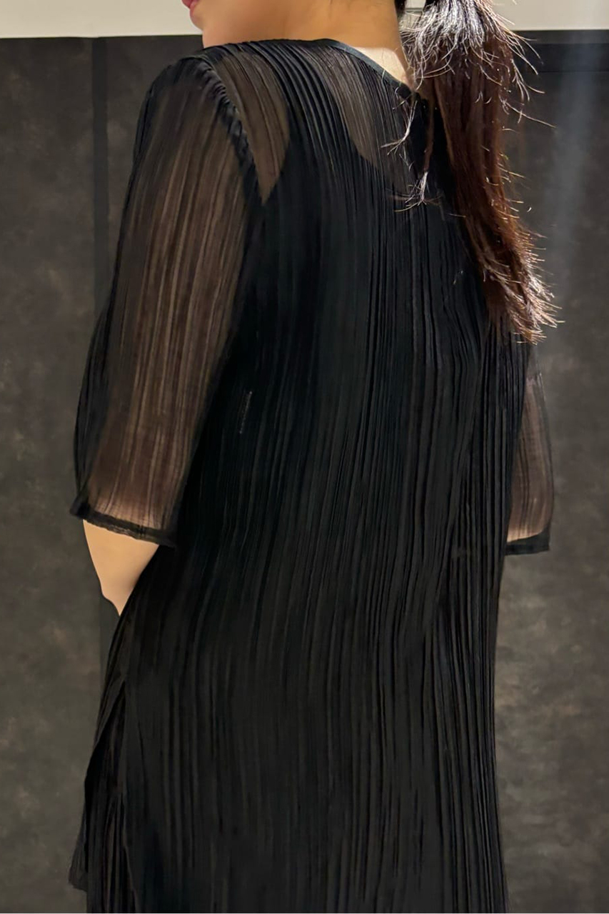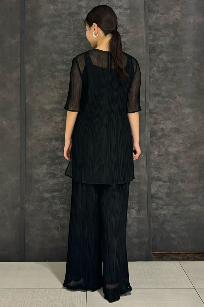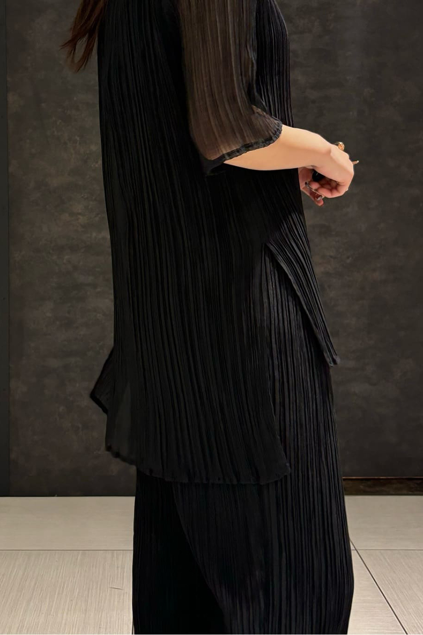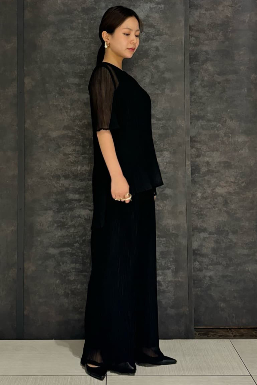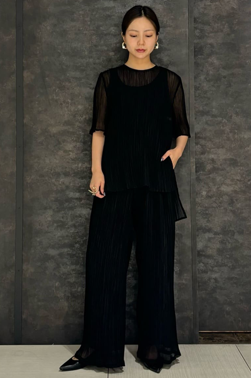 シンプルなフォルムに、シアー素材と繊細なプリーツ加工を掛け合わせた、上品な表情のセットアップスタイル。