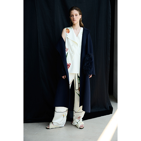 さらりとしながら、二重組織のスポンディッシュな膨らみと適度な反発感のある素材をベースに、大胆なモチーフを刺繍であらわした素材で仕立てました。