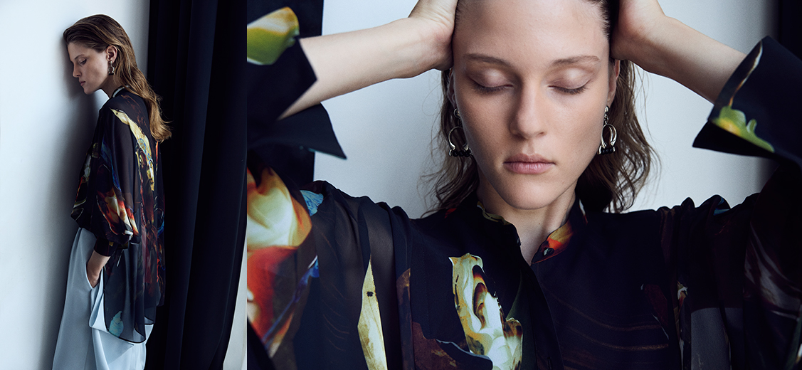 表面がフラットで、さらりとしたタッチと軽さが特徴なシフォン素材にモチーフをプリントした素材で仕立てました。