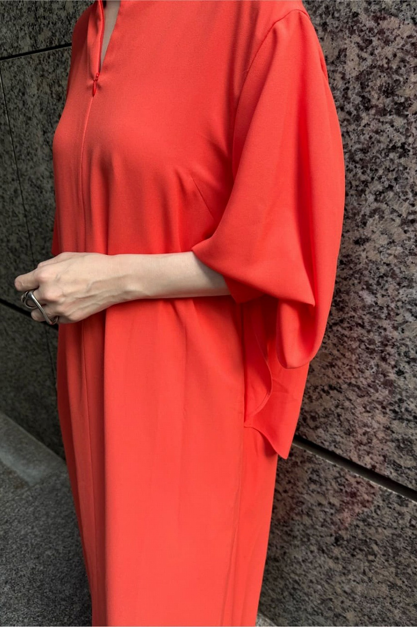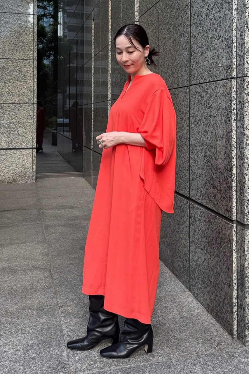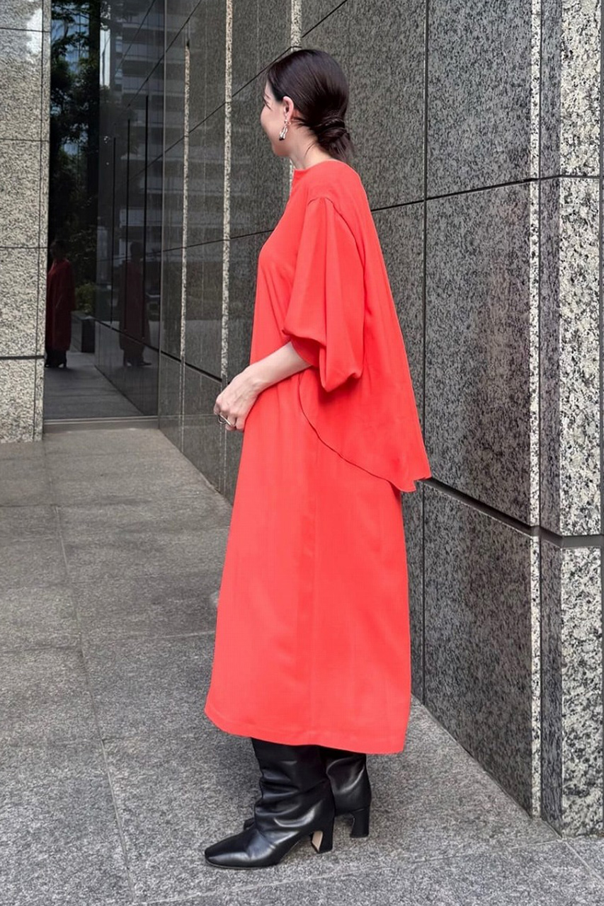 モードなシルエットが大人の女性らしさを引き立て、バックラインと袖のデザインがさりげないアクセントに。