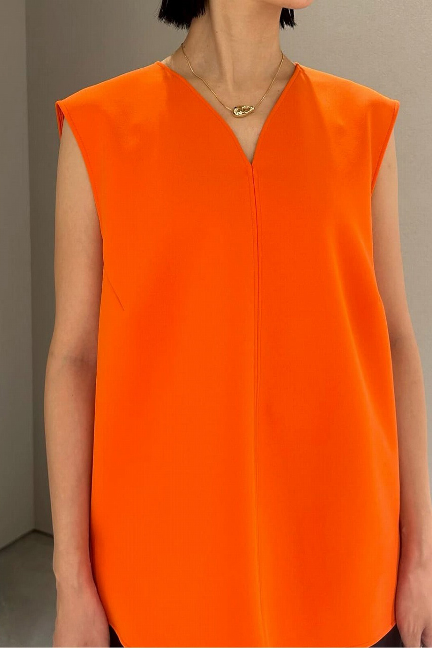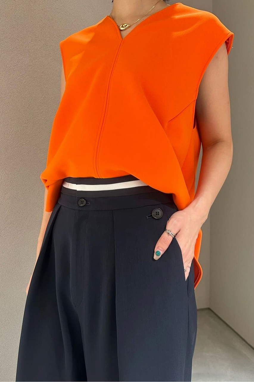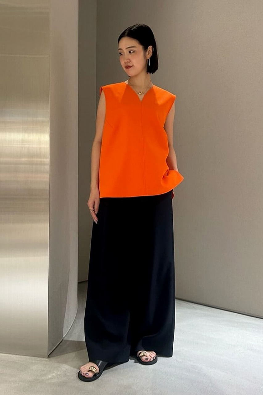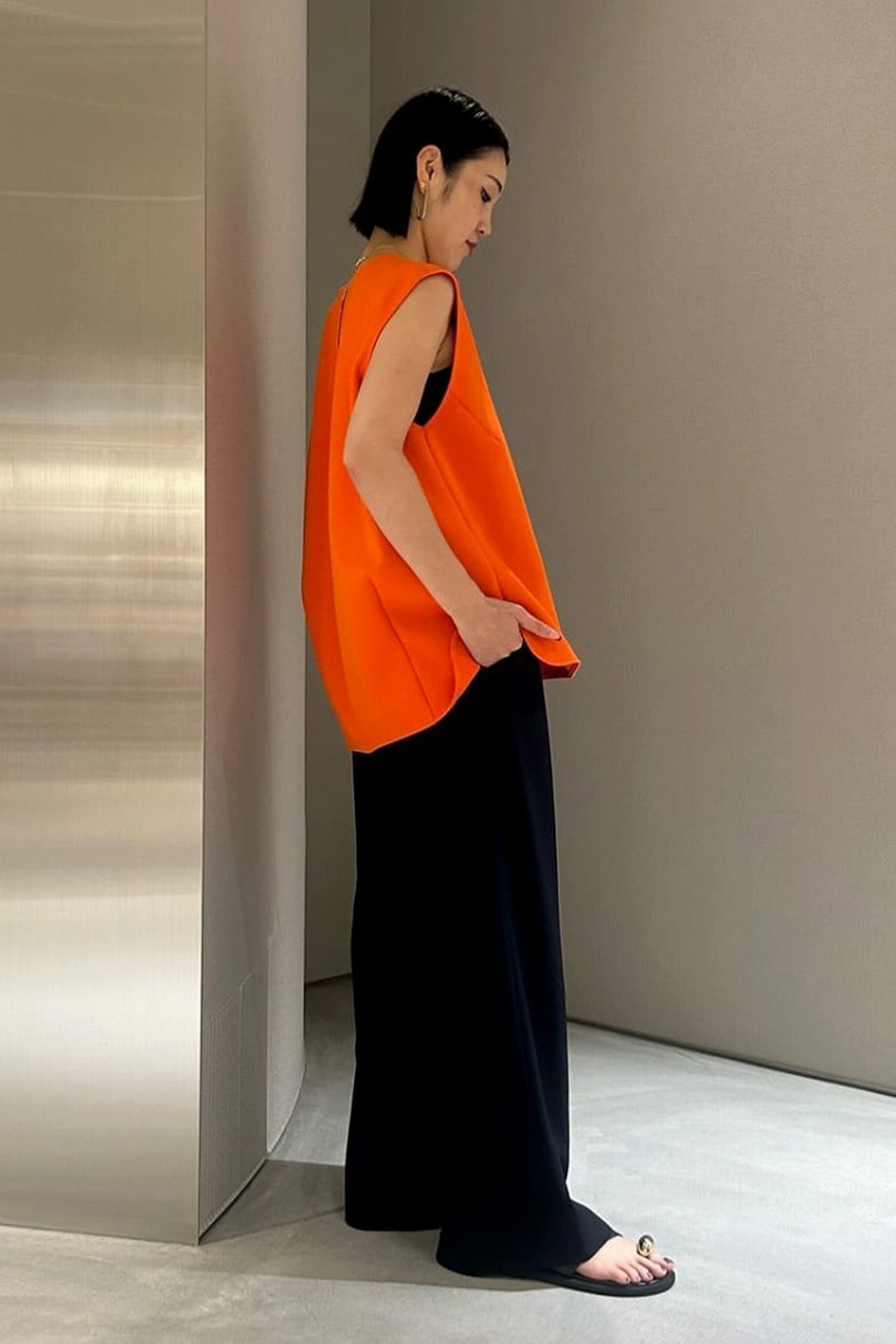 ややゆとりのあるシルエットと程よく立体的なフォルムで、リラックス感のある雰囲気です。しっかり開いたVネックでお顔周りはスッキリ、後ろはヒップが隠れるようなしっかり丈で安心。また、合わせるインナー次第で長くお召しいただける、嬉しいアイテムです。