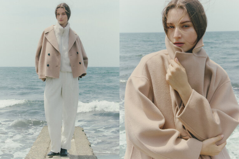 フロントは配色釦を効かせたシンプルなジレ、後ろはコクーン型にシルエットが出るよう切り替えやタックを駆使したデザイン。