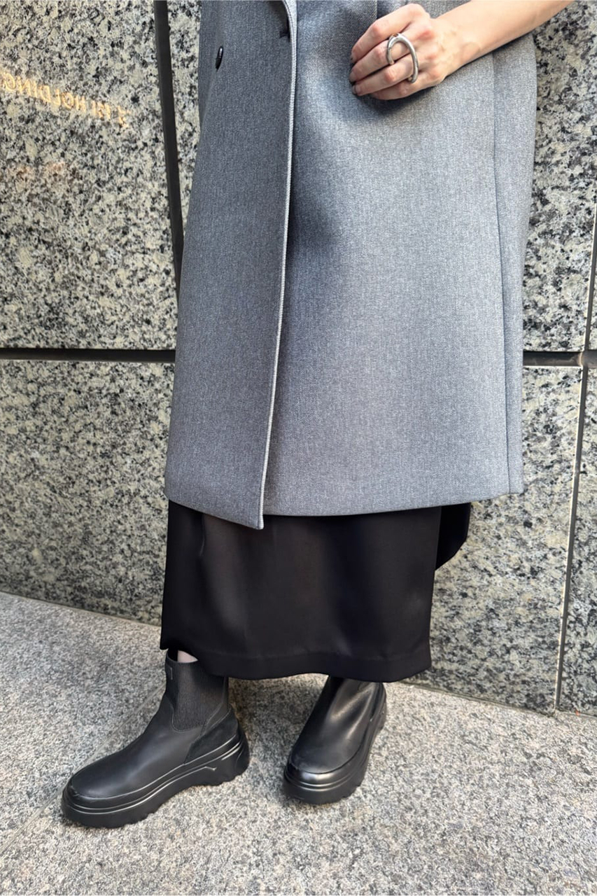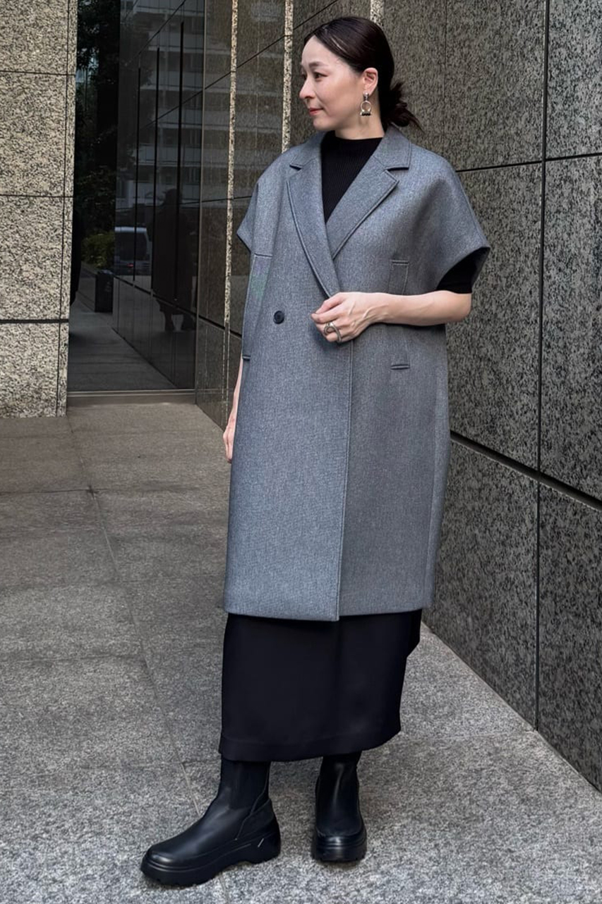 シャープなテーラードカラーで丸みを帯びたシルエットがポイントです。フロントはセミダブルの仕様になっています。