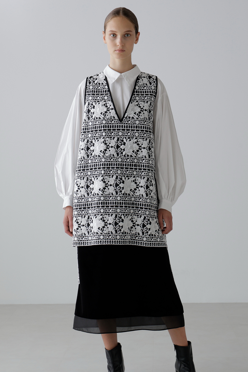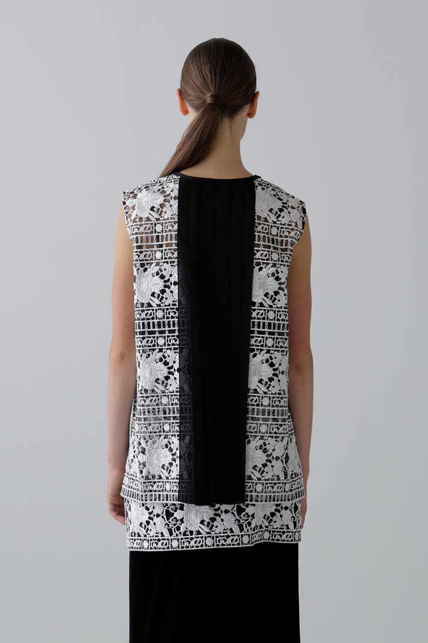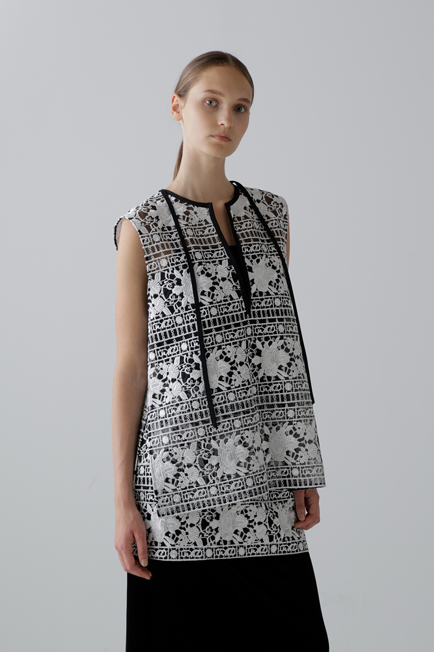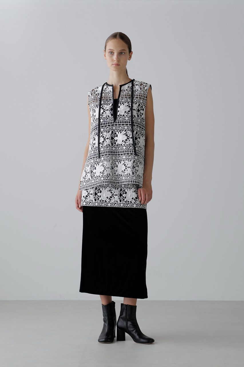 光沢とマットを組み合わせた糸で刺しゅうを施したエンブロイダリーレースで仕立てたノースリーブブラウスとスカート。トップスはみぞおちまで深く開いたキーネックが大人っぽい抜け感を演出し、背中にタック風デザインを添えて後ろ姿にもアクセントをプラス。タートルをレイヤードすれば秋冬も活躍。シアー感と立体感のある表情が魅力で、セットアップの着用もおすすめ。