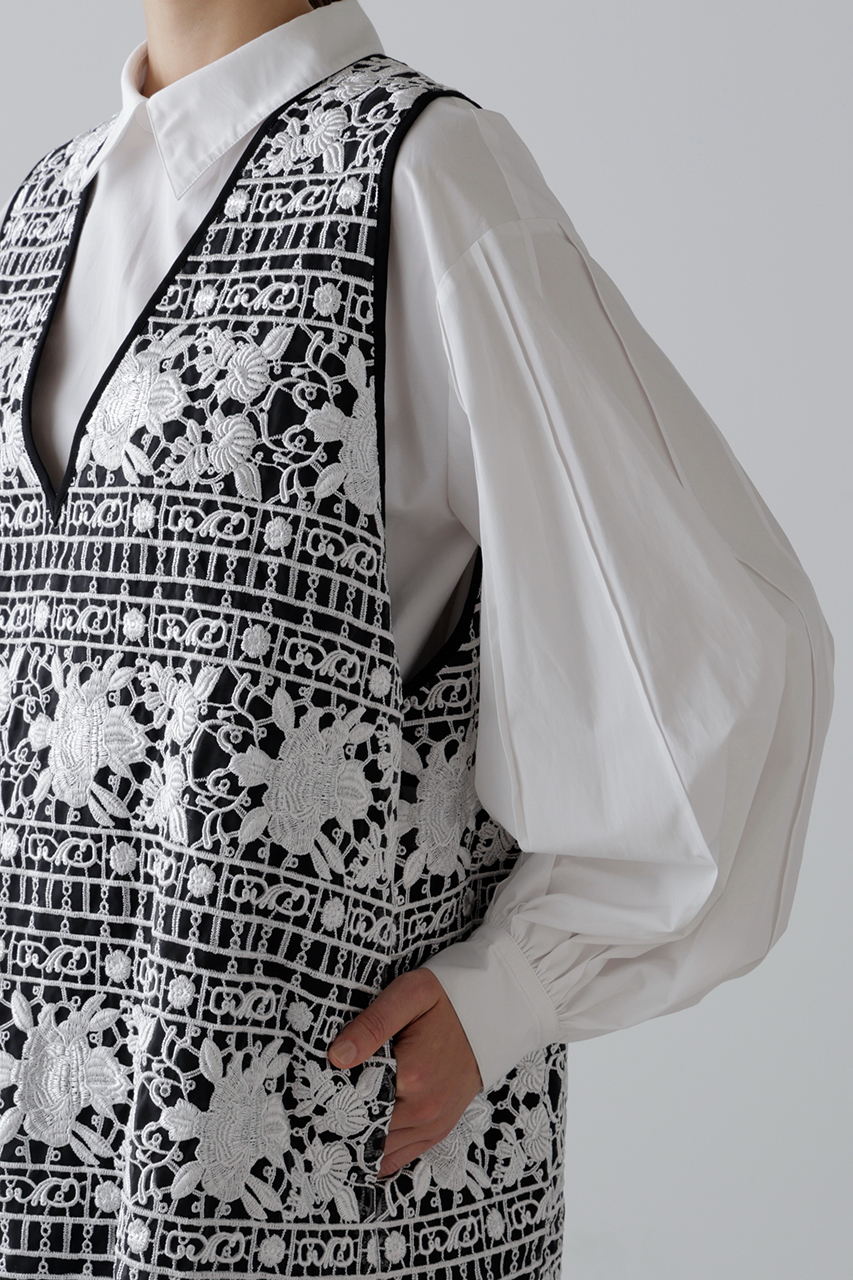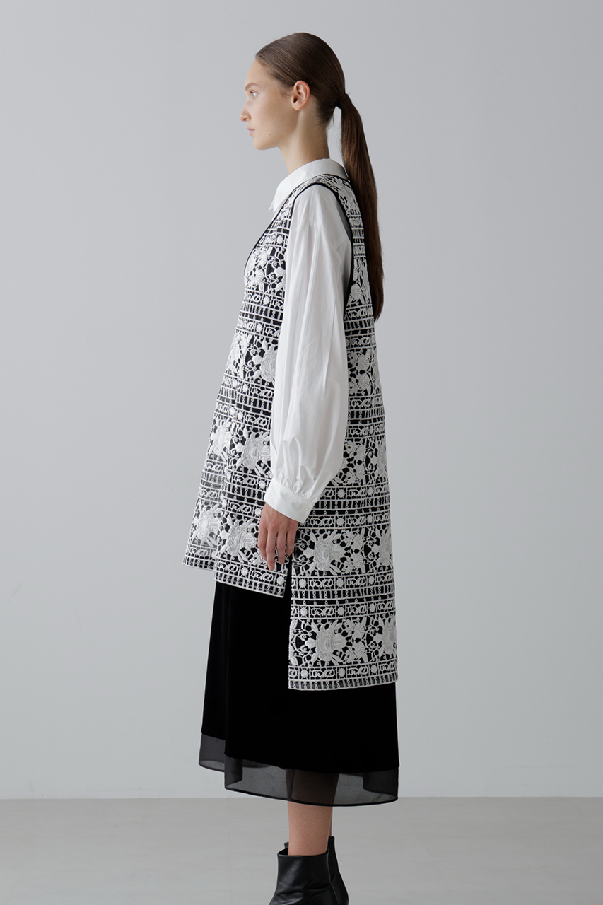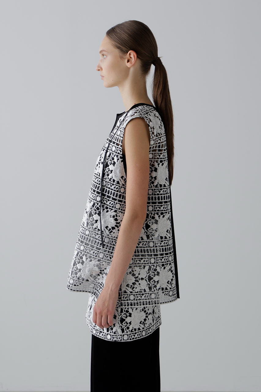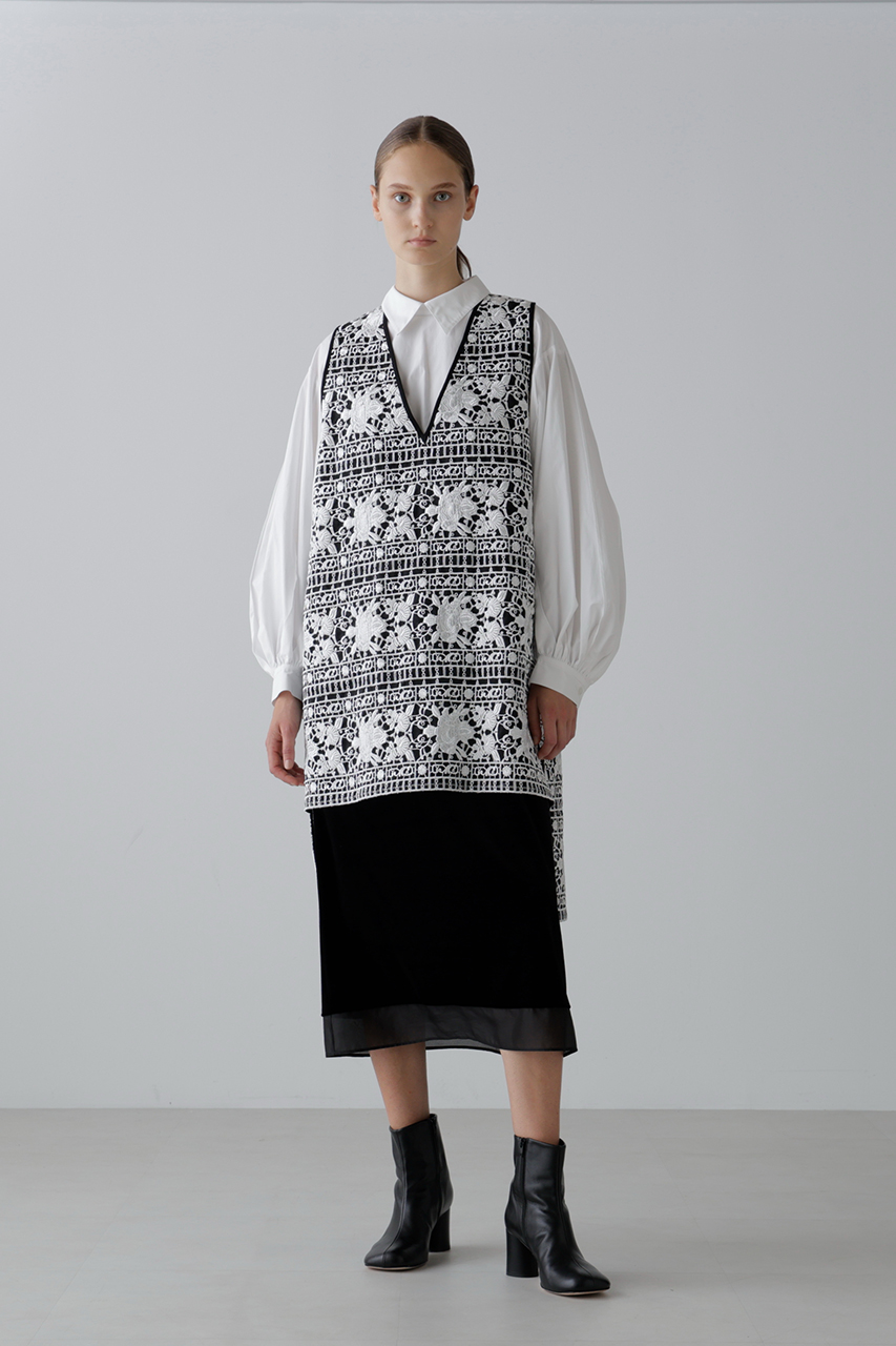 光沢とマットを組み合わせた糸で刺しゅうを施したエンブロイダリーレースで仕立てたノースリーブブラウスとスカート。トップスはみぞおちまで深く開いたキーネックが大人っぽい抜け感を演出し、背中にタック風デザインを添えて後ろ姿にもアクセントをプラス。タートルをレイヤードすれば秋冬も活躍。シアー感と立体感のある表情が魅力で、セットアップの着用もおすすめ。