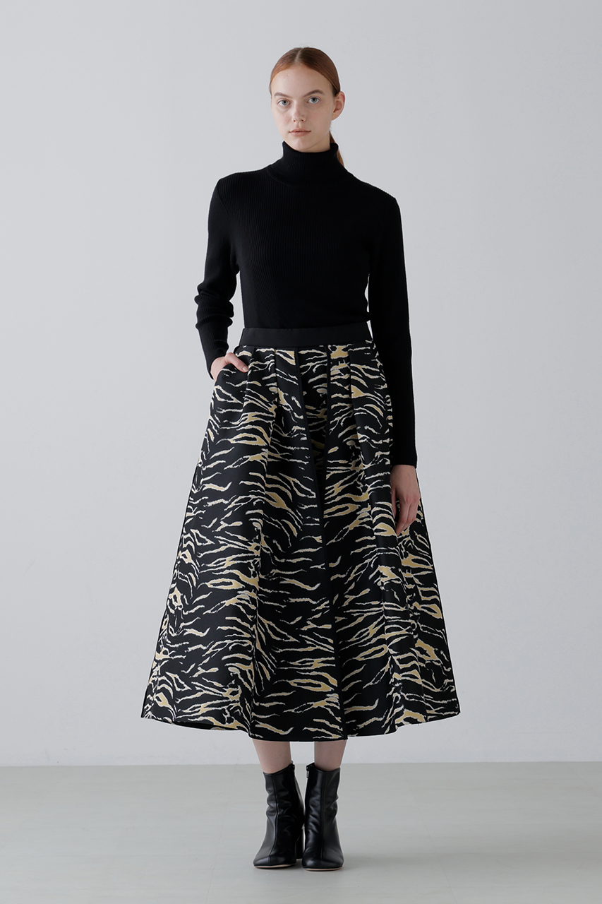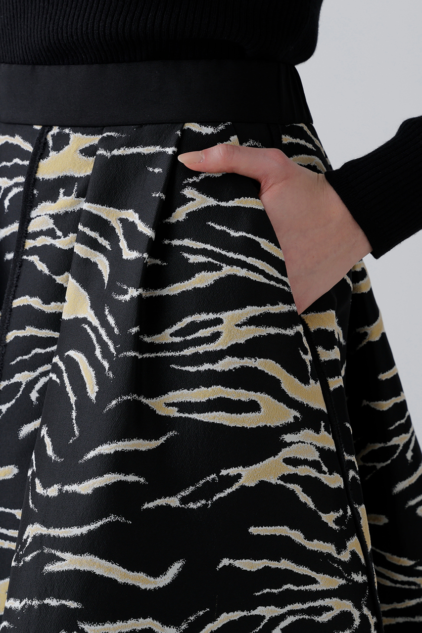 アーカイブのゼブラジャカードの素材を使用したエクスクルーシブなタックフレアスカート。マットなポリエステル糸を使用し、モチーフを二重織ジャカードであらわしたコンパクトな素材感。分量感のあるタックフレアが華やかに広がり、縦のラインにはグログランパイピングを施し、モードなアクセントに。