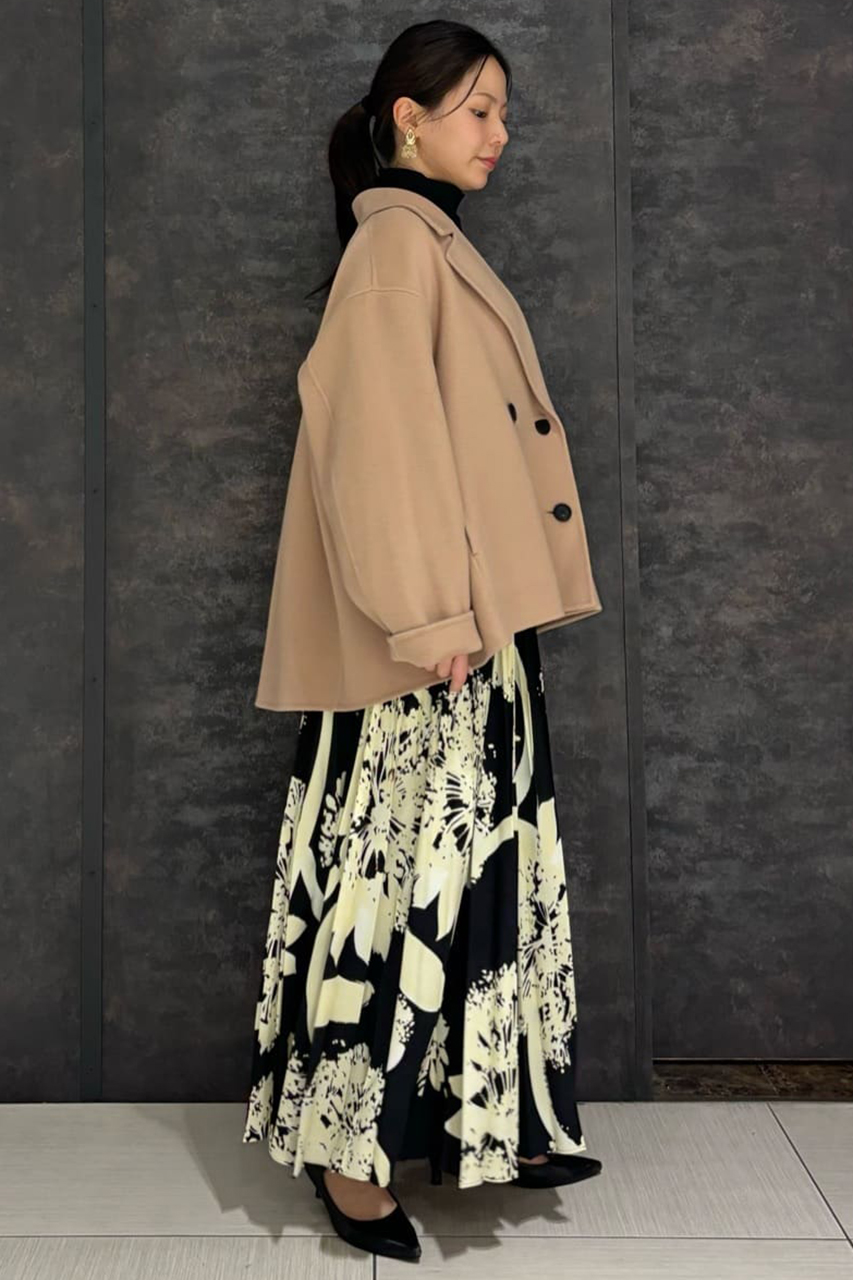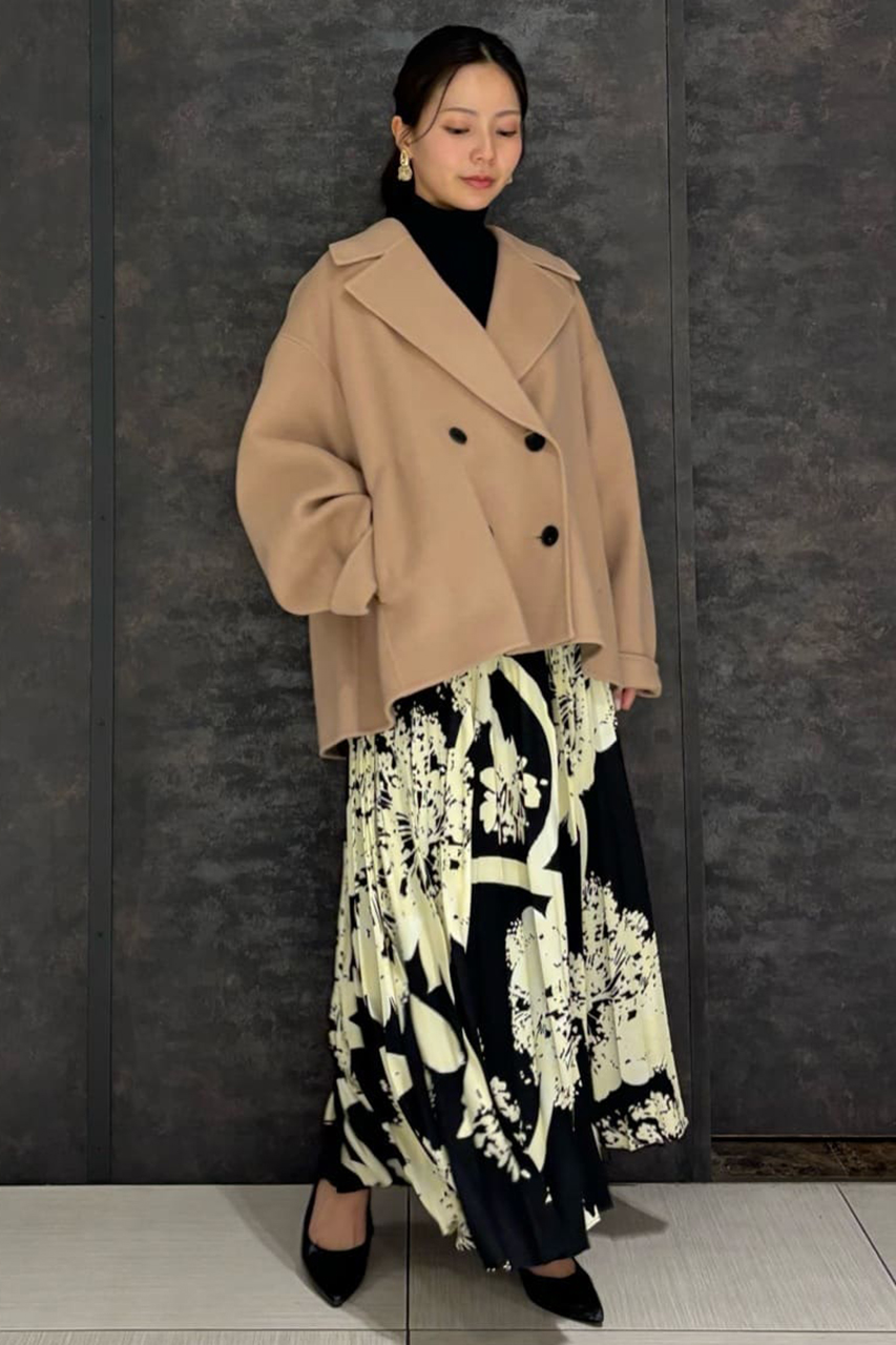 大胆なオーバーサイズシルエットとショートレングスのバランスがモダンで、Pコートデザインがきちんと感をプラス。