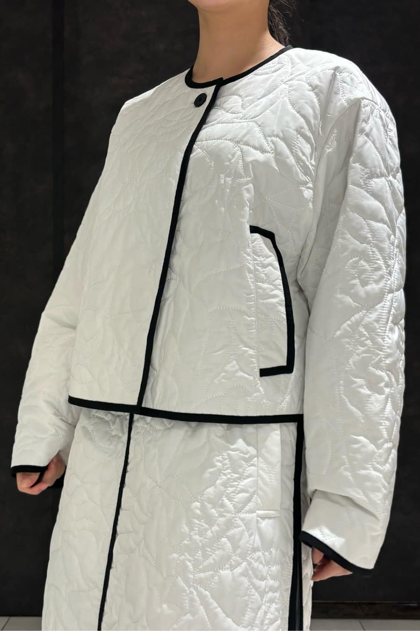 カジュアルな印象になりやすいキルティングも、グログランのパイピングで洗練された雰囲気に。