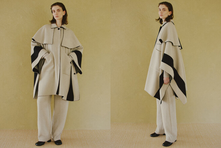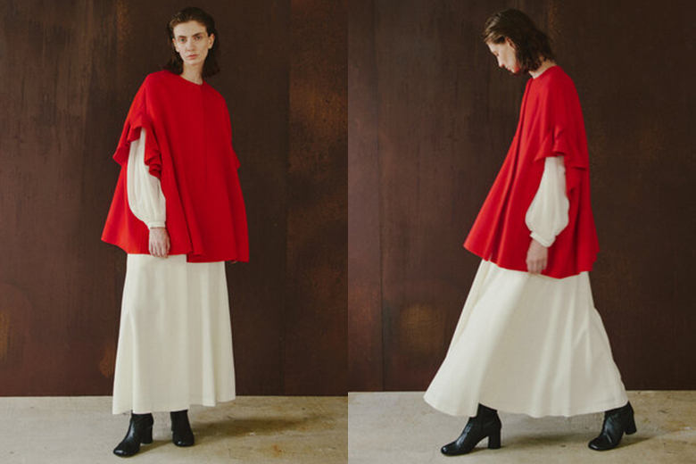 ややフレアが入ったポンチョの袖口にラッフルがついた華やかな1枚。繊維が非常に細く、保温性にも優れた、非常にしなやかなカシミヤ100%で織り上げた素材を使用。長すぎない着丈でパンツ、スカート問わずバランスよく着こなせそう。