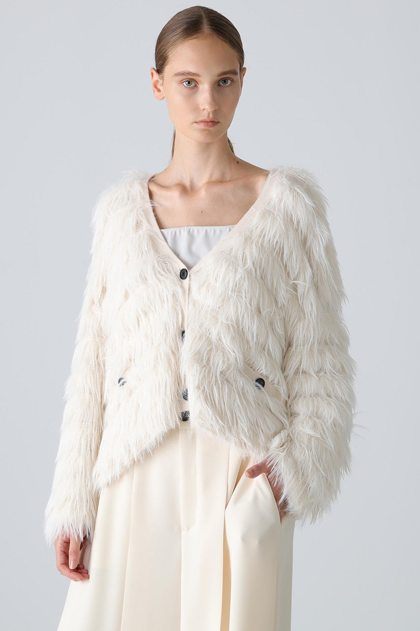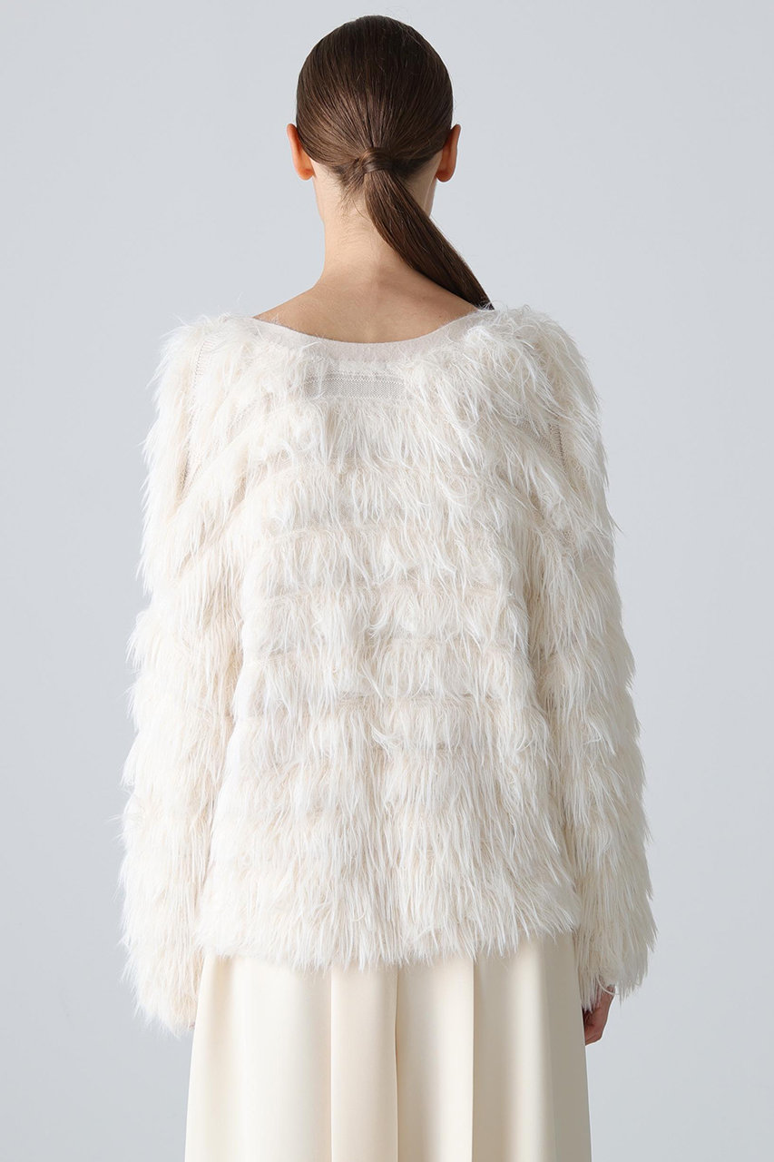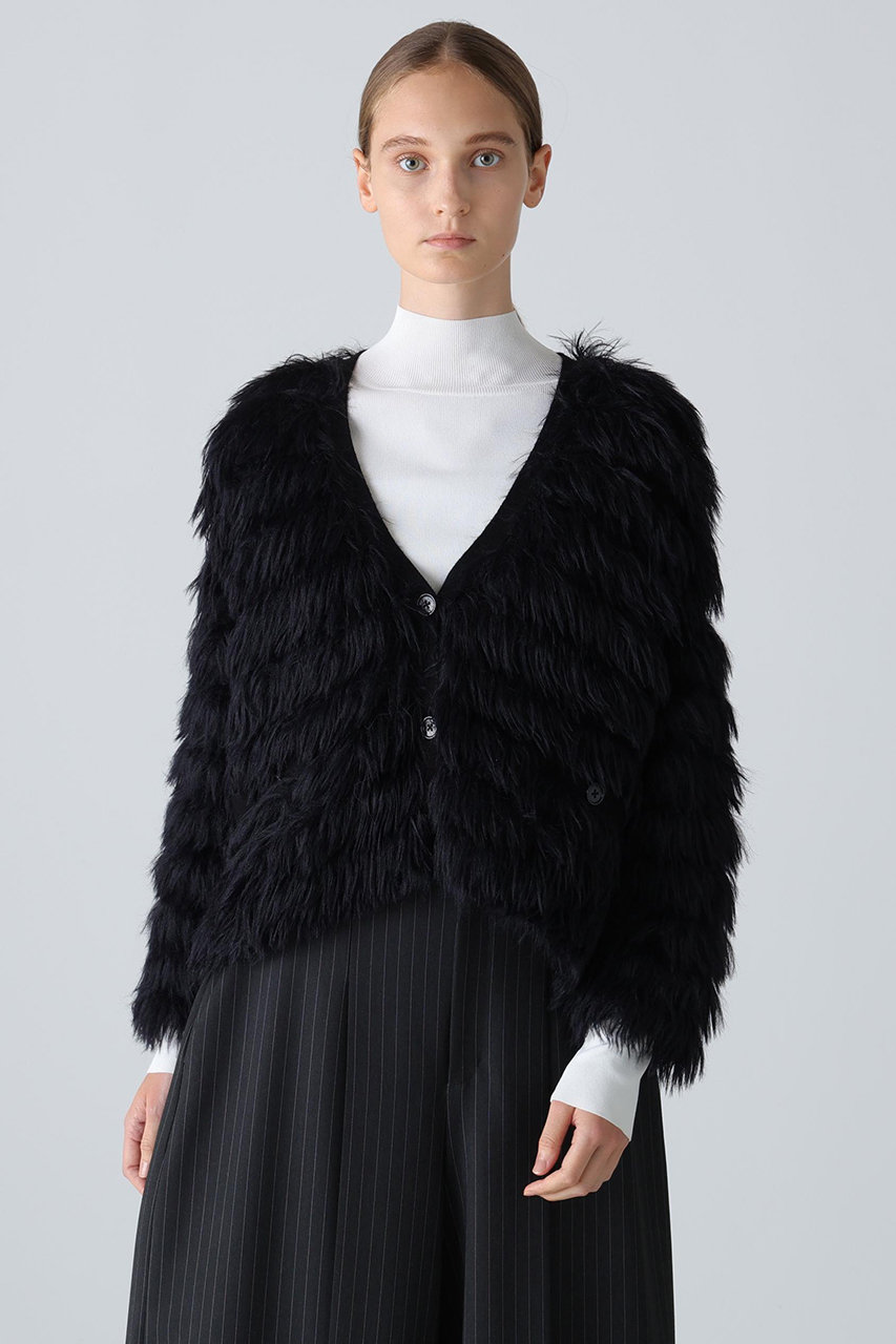 毛足の長いロングシャギー糸を使用した、存在感たっぷりのニットカーディガン。短めの着丈とコンパクトなフォルムがバランス良く、どんなボトムとも好相性。ナイロンの意匠糸とウール梳毛糸を編み分けたことで、ふんわりとしたヘアリーな質感を実現。